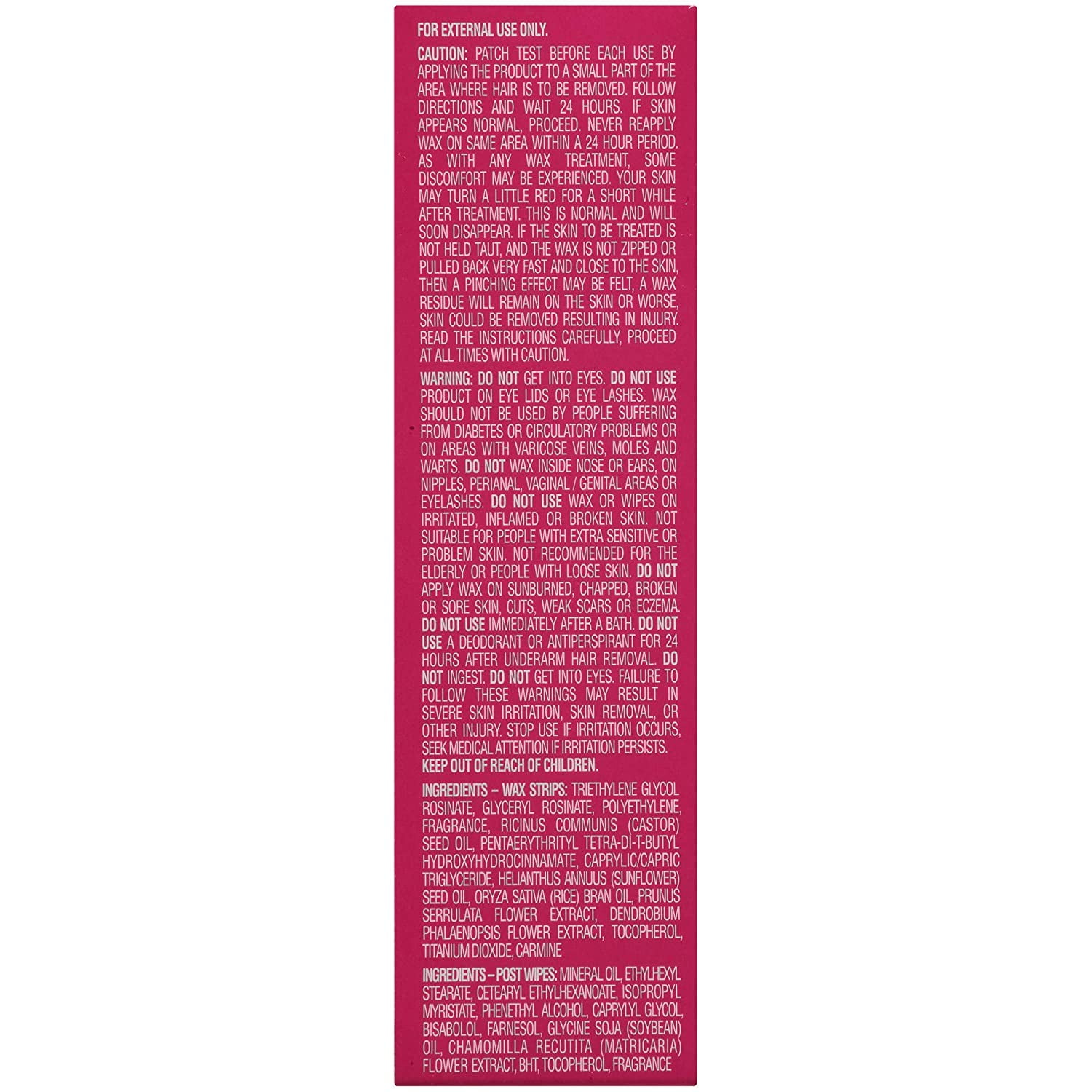 Ingredients:Wax Strips Triethylene Glycol Rosinate , Glyceryl Rosinate , Polyethylene , Ricinus Communis Seed Oil , Capric Triglyceride , Caprylic , Pentaerythrityl Tetra-di-t-Butyl Hydroxyhydrocinnamate , Helianthus Annuus Seed Oil , Dendrobium Phalaenopsis Flower Extract , Prunus Serrulata Flower Extract , Oryza Sativa Bran Oil , Post Wipes: Mineral Oil , Ethylhexyl Stearate , Cetearyl Ethylhexanoate , Isopropyl Myristate , Phenethyl Alcohol , Caprylyl Glycol , Bisabolol , Farnesol , Glycine Soja Oil (Soybean) , Chamomilla Recuitita (Matricaria) Flower Extract , BHT , Tocopherol , Fragrance
