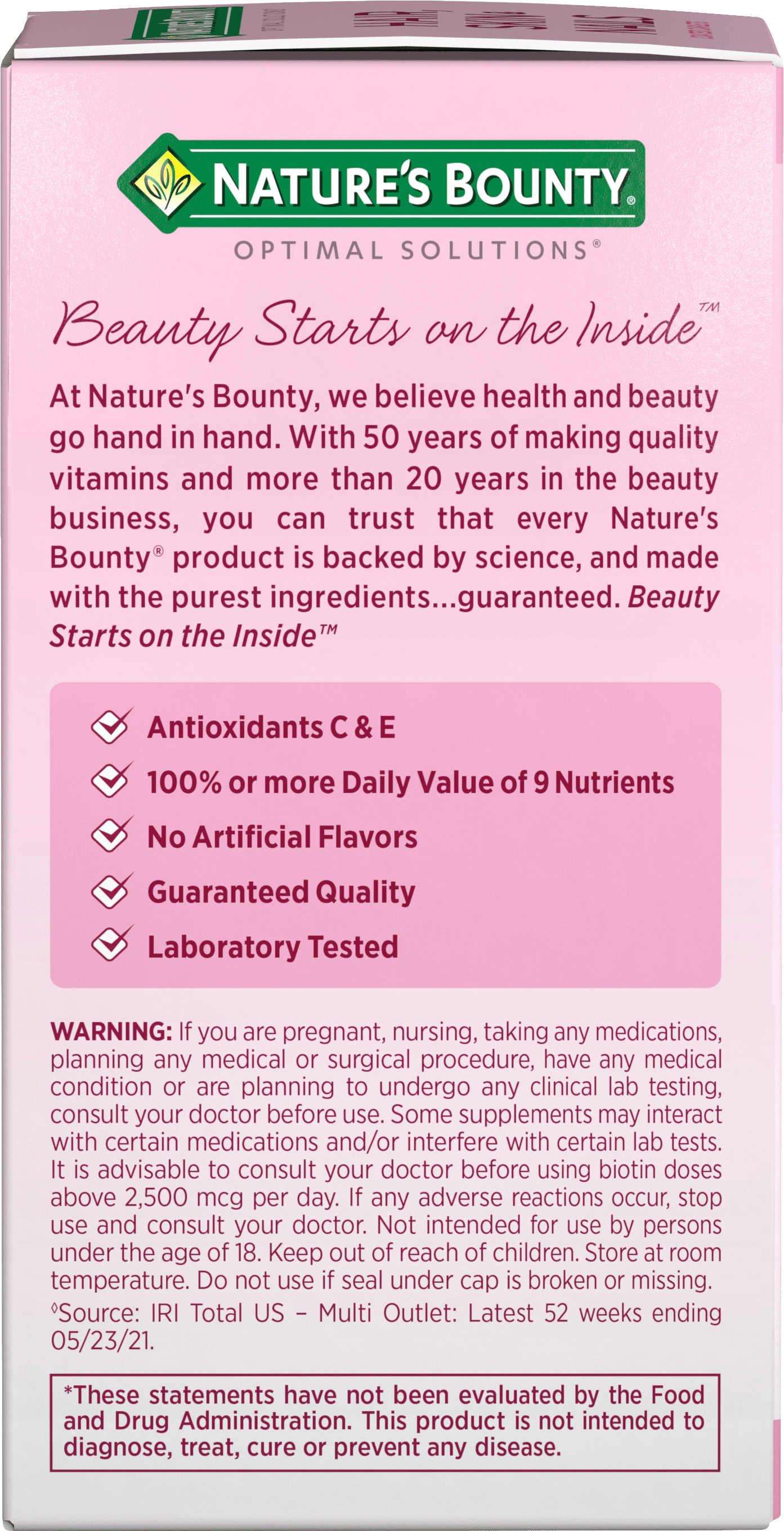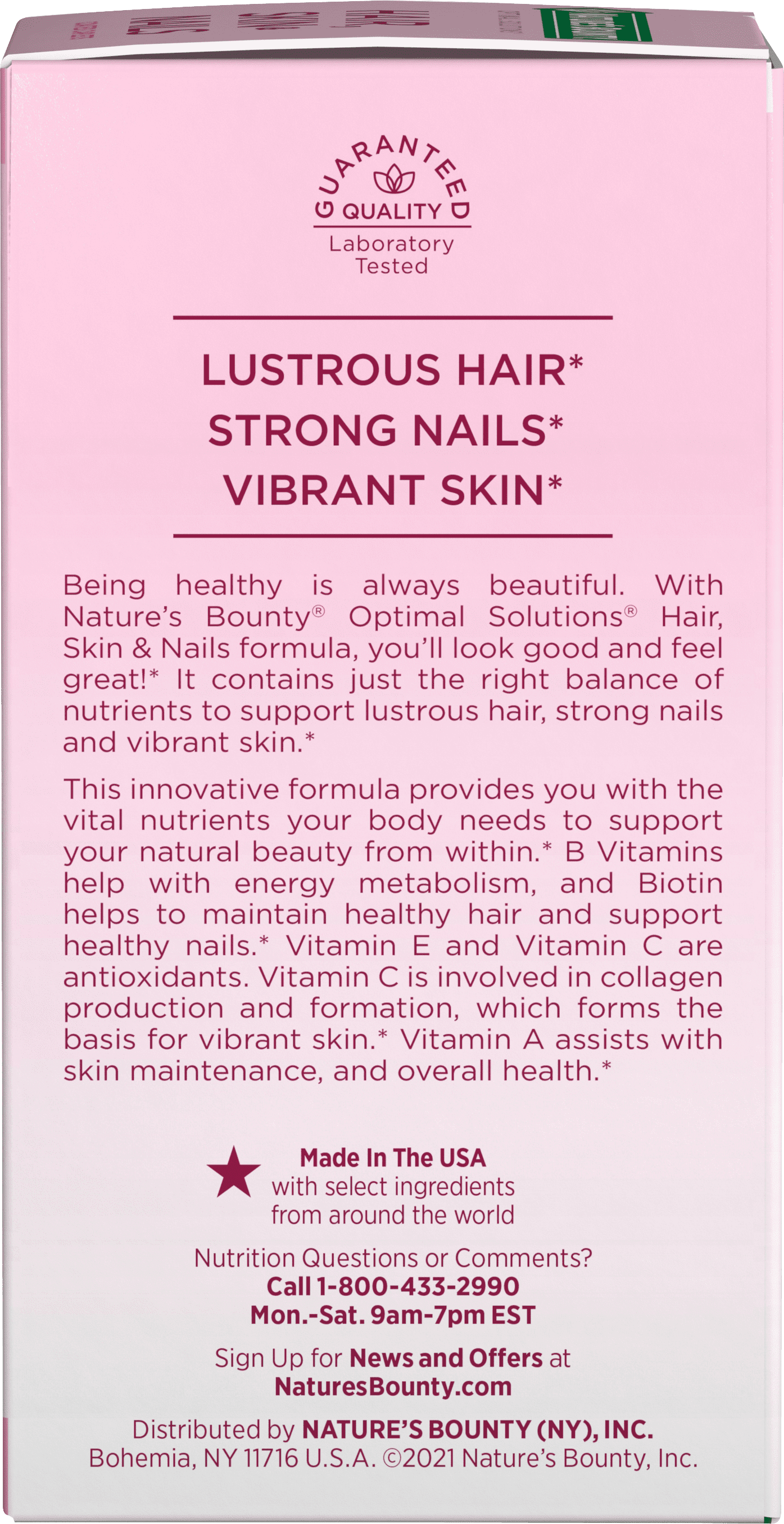With Nature’s Bounty Optimal Solutions Hair, Skin & Nails formula, you’ll look good and feel great! It contains just the right balance of nutrients to help support lustrous hair, strong nails and vibrant skin.* This innovative formula provides you with the vital nutrients your body needs to support your natural beauty from within. B Vitamins help with energy metabolism, and Biotin helps to maintain healthy hair and promote healthy nail growth by acting at the base of the nail – the nail matrix – where nail growth begins.* Vitamin E and Vitamin C are antioxidants. Vitamin E contributes to skin health, and Vitamin C is involved in collagen production and formation, which forms the basis for vibrant skin.* Vitamin A assists with skin maintenance, and overall health.* Packaging may vary