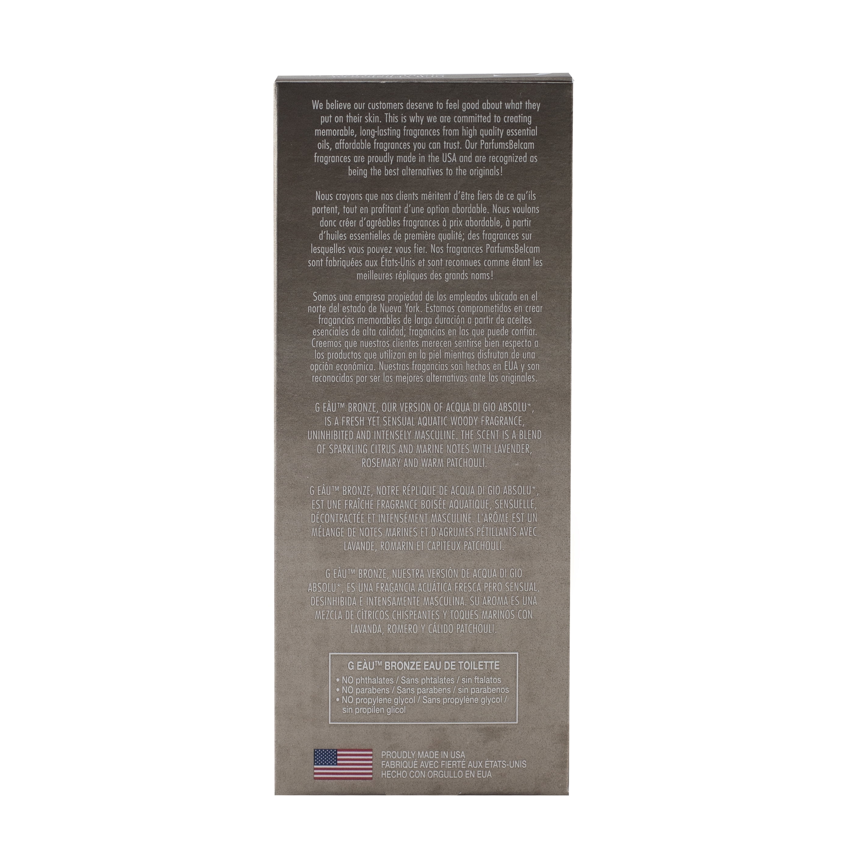 Parfums Belcam G Eau Bronze Eau de Toilette Cologne for Men, 3.4 Oz Full Size. G eau Bronze, version of Acqua di Gio Absolu* Eau de Toilette Spray for Men is a fresh aquatic-woody fragrance blending citrus, marine, lavender and patchouli notes. This long wearing version of Acqua di Gio Absolu* is an affordable alternative to the designer fragrance and is ideal for day or evening wear. G eau Bronze is not associated with Acqua di Gio Absolu*, which is the trademark of the brand name manufacturer. G eau Bronze, version of Acqua di Gio Absolu*, by PB ParfumsBelcam, Eau de Toilette Spray for Men, 3.4 oz.