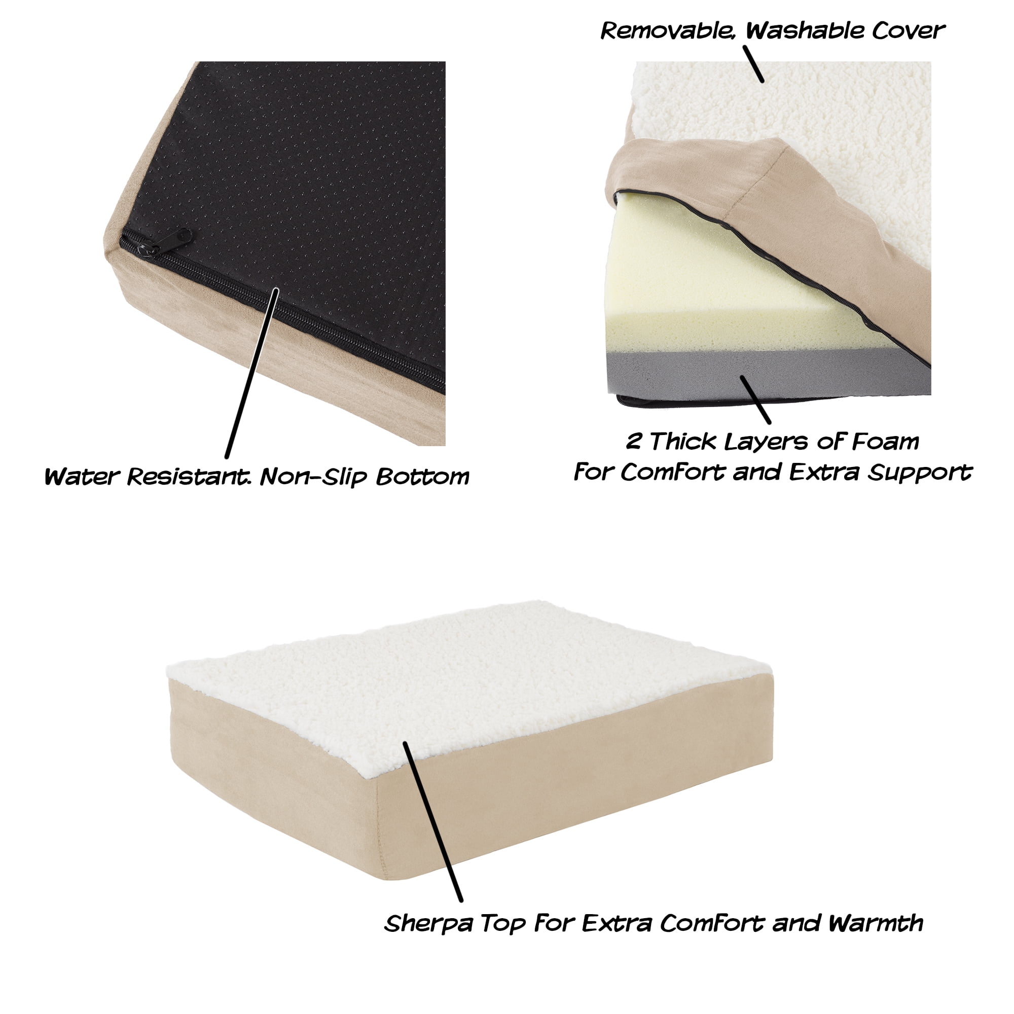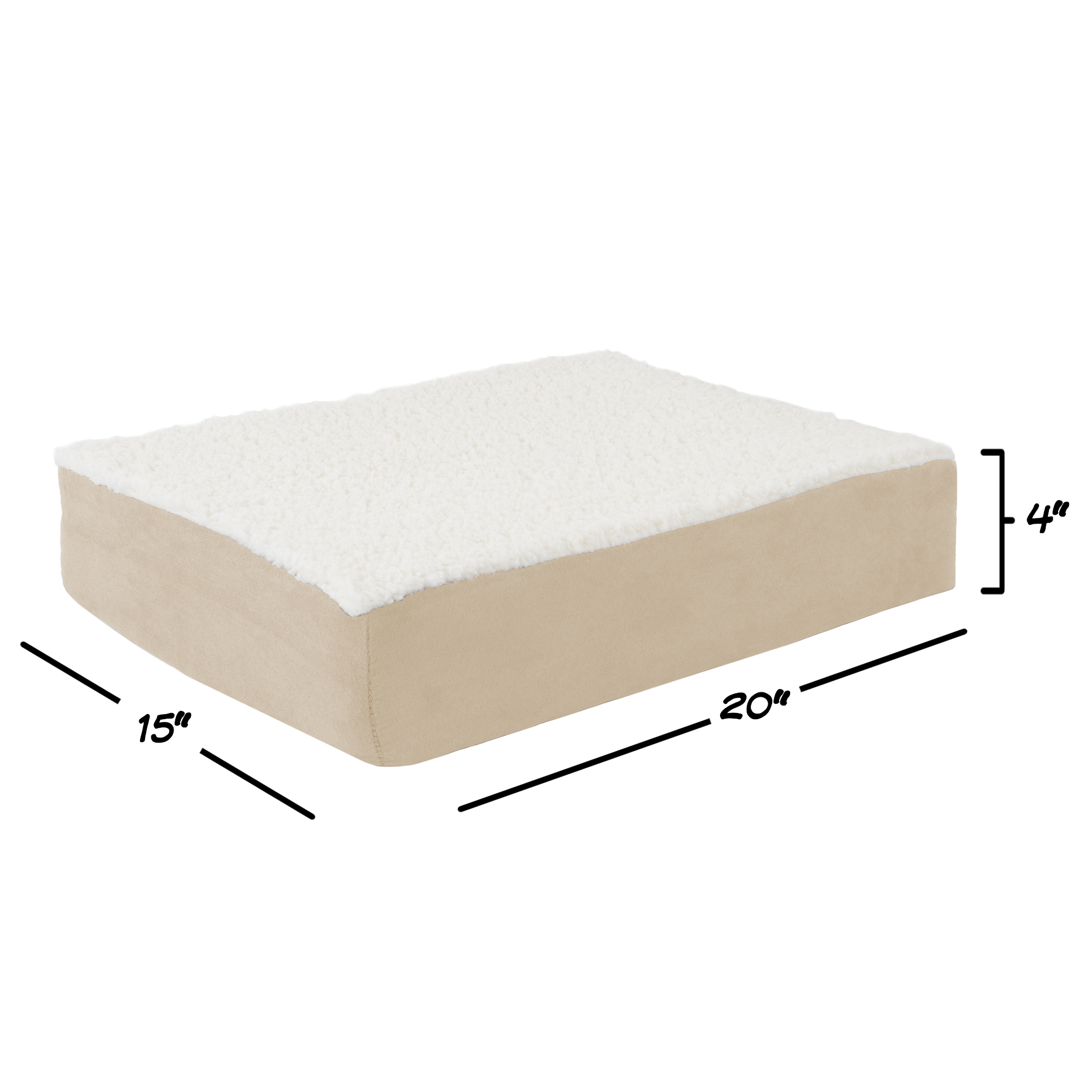 The PETMAKER Orthopedic Pet Bed with machine washable non-slip bottom cover has a two-inch layer of high density foam coupled with a two-inch layer of memory foam to provide maximum support and comfort for any dog or cat._x000D__x000D_“IMPORTANT: Avoid buying counterfeit products and transacting with unauthorized sellers. Look for our logo on the packaging for every one of our products. PETMAKER is committed to providing the consumer with the absolute best price and value on all our products, which we ensure by applying a rigorous Quality Control process. _x000D__x000D__x000D_MEMORY FOAM – The 4 inch 100% polyurethane, orthopedic foam insert is a combination of memory foam and high density foam for maximum comfort and durability. Senior and arthritic pets are especially appreciative of the joint support this bed provides. Spot clean with mild soap and water, air dry._x000D_REMOVEABLE AND MACHINE WASHABLE COVER – The 100% polyester micro suede with sherpa top removable cover is easy to clean and has a non-skid bottom. For best results, machine wash or clean with a light vacuum._x000D_PRODUCT DETAILS – Recommended for dogs or pets 20 lbs or less. Dimensions: 20 inches (Length) x 15 inches (Width) x 4 inches (Height), Color: Tan_x000D_100% CUSTOMER SATISFACTION GUARANTEE – We are confident that the PETMAKER brand products are the highest quality and workmanship, however if you are not completely satisfied just return the item for a refund. NOTE: This is an exclusive product of PETMAKER and ONLY Orthopedic Sherpa Top Beds with Memory Foam from PETMAKER are GUARANTEED to be genuine._x000D__x000D_The PETMAKER Orthopedic Pet Bed with machine washable non-slip bottom cover has a two-inch layer of high density foam coupled with a two-inch layer of memory foam to provide maximum support and comfort for any dog or cat.