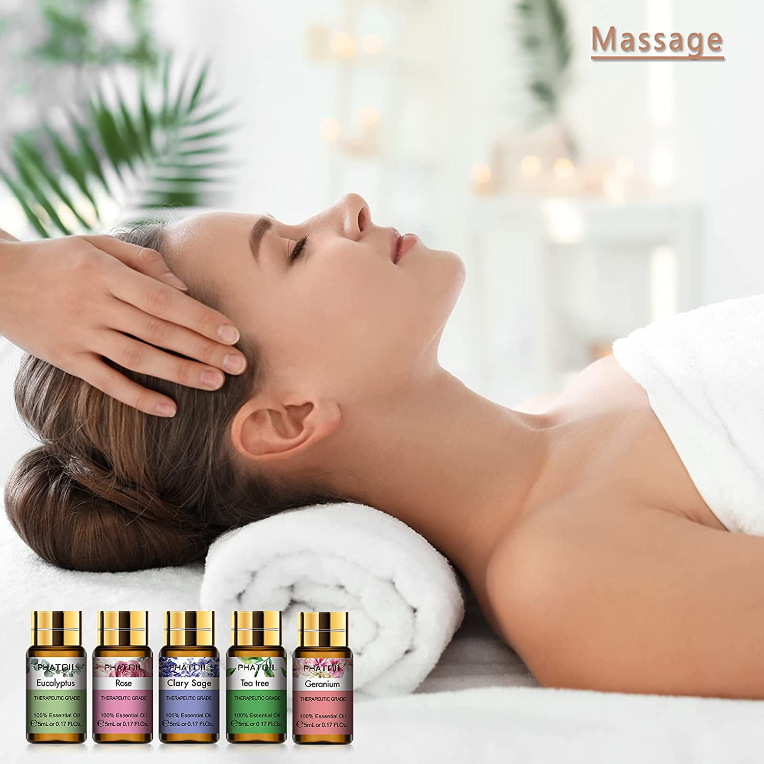 - PHATOIL essential oils set include 12 different aromas: Rose, Lemon, Tea Tree, Lemongrass, Citronella, Clary Sage, Lavender, Eucalyptus, Peppermint, Sandalwood, Geranium,and Bergamot. Combine 12 essential oils with your imagination and creativity, achieving unexpected and ultimate surprise during a whole week.