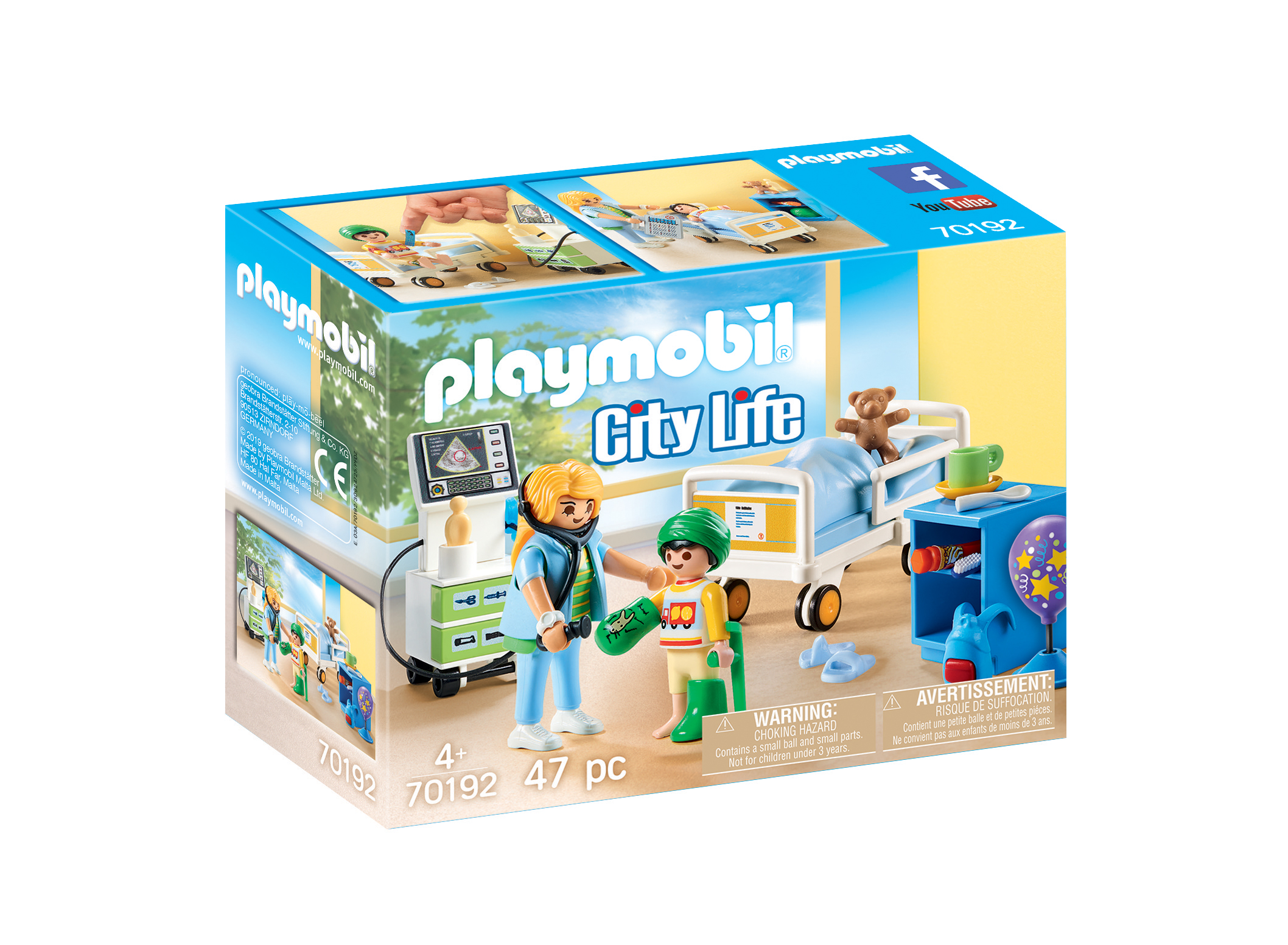 The Children’s Hospital Room is designed with young patients in mind. Child-sized medical equipment and decor on the walls makes staying in the hospital a little more comforting. A teddy bear and balloon are gifts sent with well wishes on a speedy recovery. The nurse is able to check vitals and monitor the healing process. Once everything has healed, remove the casts and head bandages and send the patient home to his family. Set includes two figures, hospital bed, rolling medical monitor and cart, bedside table, bandage stickers, removable cast, and many other accessories. Recommended for ages four years and up. Warning. Choking Hazard. Contains a small ball and small parts. Not for children under 3 years.