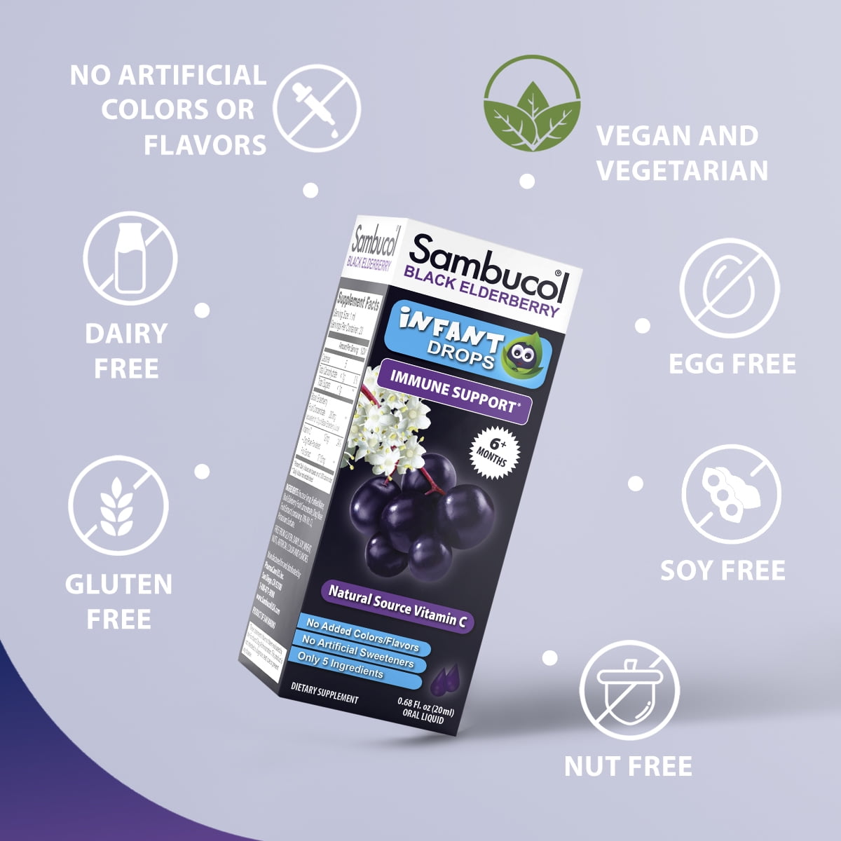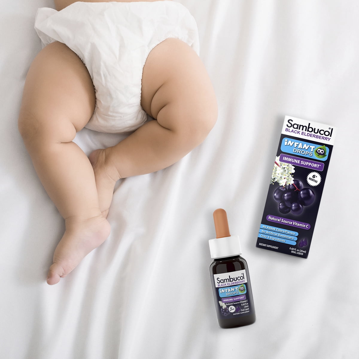 Your baby’s immune system is constantly being tested. Help support their developing immune system with Sambucol Black Elderberry Infant Drops.* Made with just 5 simple ingredients, our baby drops provide gentle yet powerful immune system support* for babies 6 months and older. They are perfect for little ones in daycare or with older siblings in school. Our drops are easy to dispense. You can squeeze the drops right into your baby’s mouth using the provided dropper. Or mix the elderberry into their milk, formula or water for mess-free administration. Our baby drops are made using the premium European Haschberg variety of black elderberry (Sambucus nigra). Dog Rose Fruit Extract provides added Vitamin C for even more immune support benefits.* Sambucol is The Original Elderberry brand, trusted by millions worldwide. Berry simple. Berry tasty. Berry powerful immune support.*