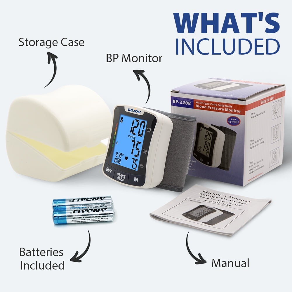 Sejoy digital wrist-type blood pressure monitor has been clinically tested and verified to ensure measurements accurately. With one button operation,could get your systolic pressure,diastolic pressure and pulse rate. This BP machine supports the following functions: irregular heartbeat detection,WHO classification indicator,last 3 results average,low battery detection,automatic power-off.