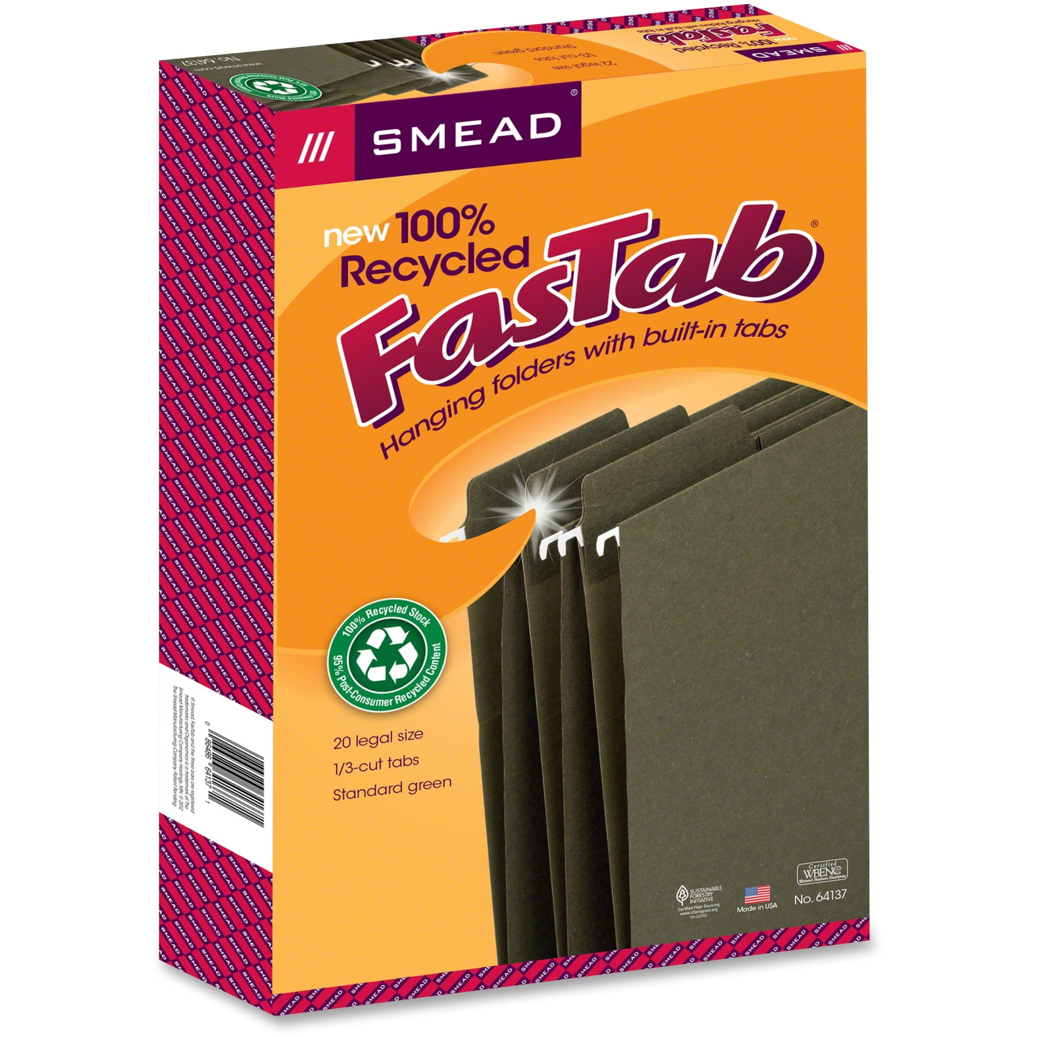 Smead, SMD64137, 100% RecycledFasTab Hanging Folders, 20 / Box, Standard Green