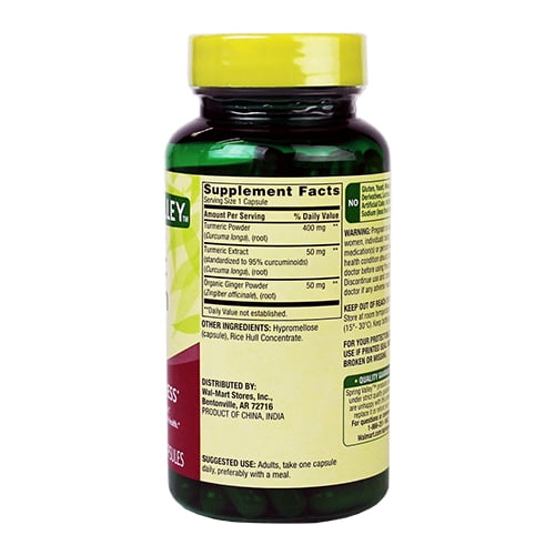 Spring Valley Turmeric Curcumin with Ginger Powder is a dietary supplement that promotes general wellness and supports a healthy inflammatory response while also supporting cardiovascular, immune, joint, and skin health.* Turmeric is a bright yellow herb that has been used throughout the world for centuries and is an important herb in ayurvedic wellness. Each vegetarian capsule contains 400 milligrams of turmeric powder, 50 milligrams of turmeric extract, and 50 milligrams of organic ginger powder to support inflammatory health and general wellness.* The 50 milligrams of turmeric extract in this supplement is standardized to 95% curcuminoids, an important bioactive compound found in the root of the turmeric plant. Each container comes with 250 single-serving, GMO-free vegetarian capsules free from gluten, yeast, wheat, milk or milk derivatives, lactose, soy, and sugar, and contain no artificial colors or flavors. They also contain no preservatives, artificial colors, or artificial flavors. Supplement your healthy lifestyle with Spring Valley Turmeric Curcumin with Ginger Powder.