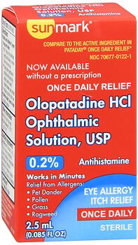 Temporarily relieves itchy eyes due to pollen, ragweed, grass, animal hair and dander. Once daily relief. Works in minutes. For ages 2 and older. 30 day supply. Once daily relief. Works in minutes. Relief from allergens: pet dander pollen grass ragweed. Sterile.Sunmark Olopatadine HCI Ophthalmic Solution, USP – 2.5 ML