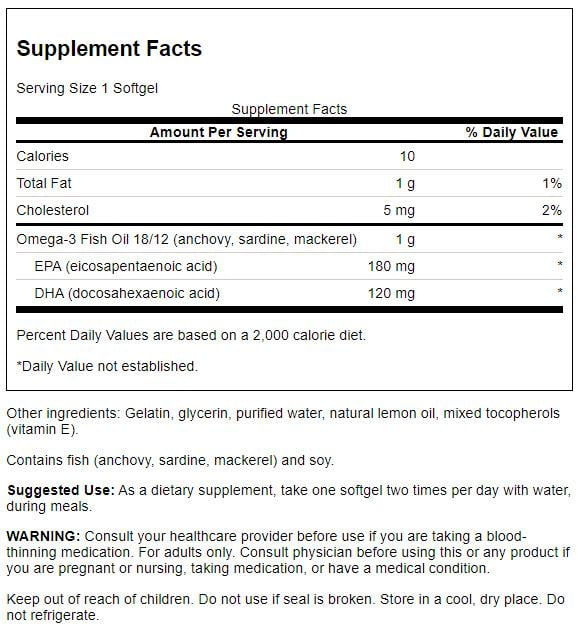 Give your heart, brain and joint health a boost with Swanson Premium Omega-3 Fish Oil – Lemon Flavor. Our molecularly distilled fish oil is derived from high quality ingredients and delivers the benefits of healthy omega-3 fatty acids in a convenient, lemon flavored formula. With 180 mg of EPA (eicosapentaenoic acid) and 120 mg of DHA (docosahexaenoic acid) per softgel, you’ll get the important, omega-3 fatty acids you need to help support cardiovascular health, healthy cognitive function, joint health and more. Swanson Premium Omega-3 Fish Oil Lemon Flavor is sourced from GMO free anchovies and sardines, and superior molecular distillation means you get a pure form of fish oil. Try our lemon-flavored fish oil and enjoy the nutritional benefits of healthy omega-3 fatty acids.