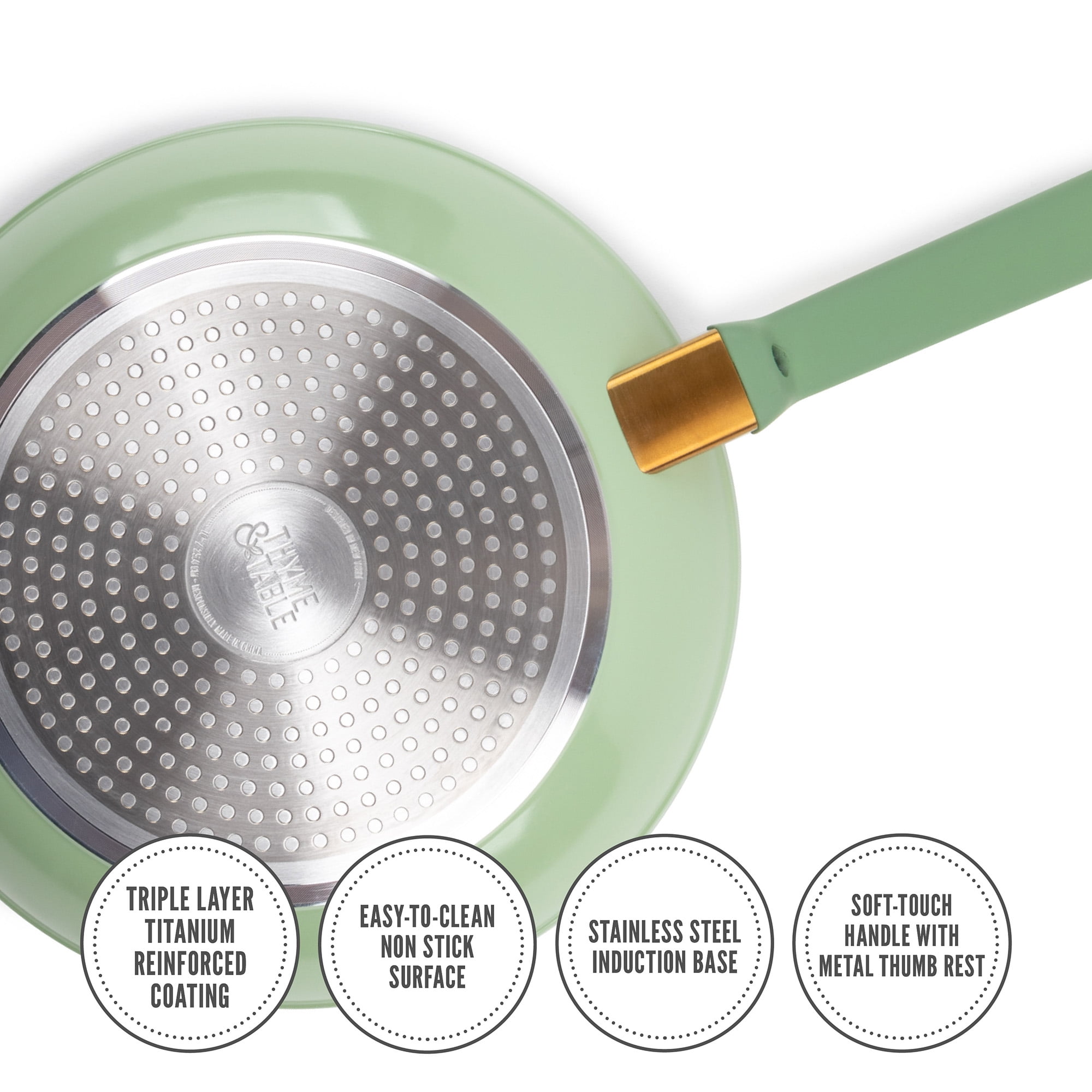 PRODUCT INFO Featuring the speckled interior and charming green hue of the Granite Collection, this 10" fry pan is a practical and reliable addition to any stovetop. Outfitted with a soft-touch handle that stays cool while you cook and a nonstick finish that ensures rapid food release, this adaptable pan is ideal for steaming, frying, searing, and so much more. CARE AND USE Wash in warm water before first use. Do not soak for extensive periods. Hand washes are recommended for the product’s longevity. Do not use in microwave. Do not use the lid in the oven. Avoid abrasive cleaners. Avoid using steel wool, steel scouring pads, or harsh detergents. Always use caution when handling an open flame. ABOUT THYME & TABLE Thyme & Table is a unique collection of kitchen essentials curated for recipe gurus and enthusiastic foodies who crave bold style and unmatched quality. We have crafted a selection of kitchenware that will transform any kitchen into your personal cooking oasis. Explore all that Thyme & Table has to offer from cookware to storage necessities and cleaning basics and find the reliable and eye-catching products that compliment your colorful lifestyle.