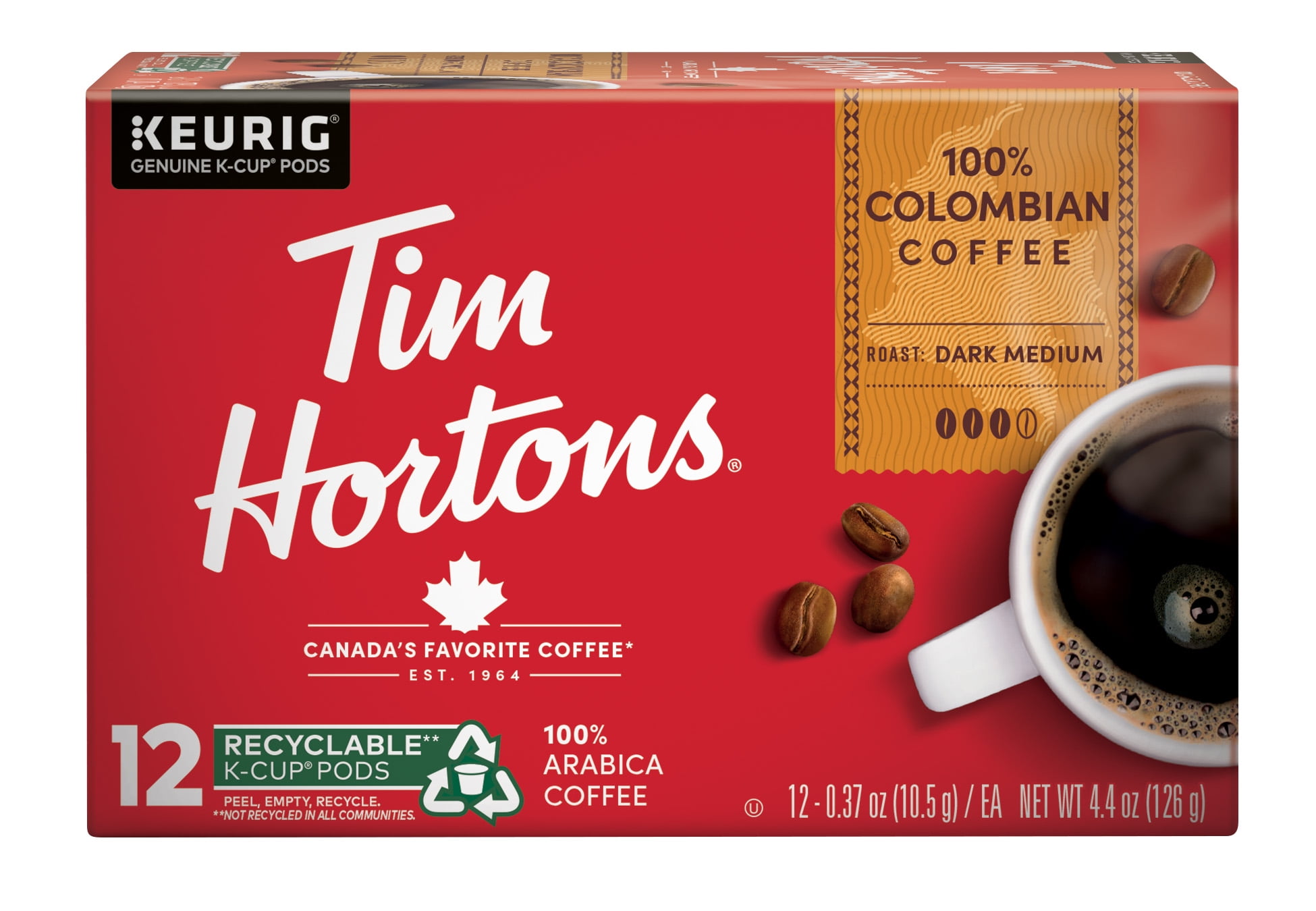 Tim Hortons Colombian Medium-Dark Roast K-Cup Coffee Pods for Keurig Brewers, Recyclable, 12 Ct