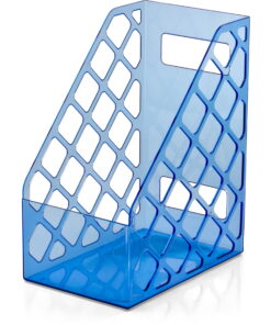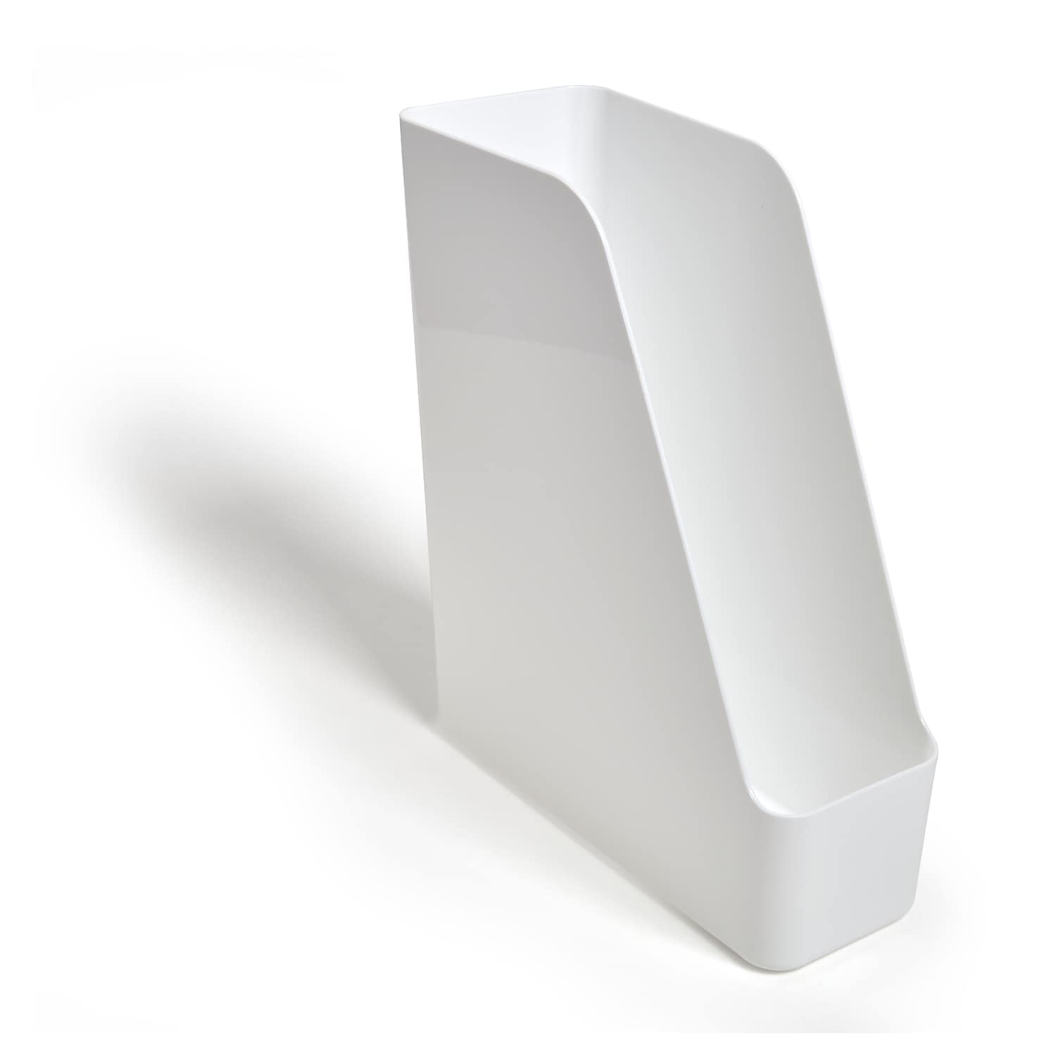 - White glossy finish plastic magazine file adds style to your work space. Use stand alone or mix and match with other pieces.