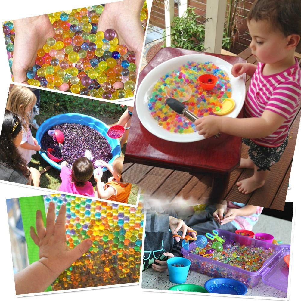 - Endless Profusion of Fun: Bright Colorful Jelly beads expand to 9 to 12mm inches and soft to grab. For foot spa, plant vase fillers, jelly beads pool game, shooting games and home decoration, anniversaries, weddings, etc.Educational Magic Toys – Crystal clear & cool Icy tactility after absorbing water. Can be kids sensory play, color recognition, motor skills, counting skills, imagination creating and so on.Environmentally Material – Made of non-toxic environmental friendly resin and not easy to break or fade. Circular particles with high elasticity and good toughness.Good Water Absorption – Need only 3-4 hours in water to expand. Will shrink if being wrapped by tissue and expand again in water. Funny to play with.Huge Pack of Joy – 50000 beads 6 different colors: red, blue, yellow, green, orange and transparent.
