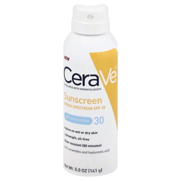 - Other Information: Protect this product from excessive heat and direct sun. May stain fabrics. Misc: Applies on wet or dry skin. Lightweight, oil-free. Water resistant (80 minutes). With ceramides and hyaluronic acid. New. Developed with dermatologists. Questions? Toll-free number (800)-321-4576. www.CeraVe.com. Valeant, consumer products. CeraVe Wet Skin Spray SPF 30 is like no other sunscreen you’ve ever experienced. Apply to wet or dry skin for powerful protection from the sun’s dangerous rays. Once applied to wet or dry skin, it forms a barrier that visibly repels water and retains ultimate protection. This new lightweight formula spreads easily and dries with a clear finish. Ceramides helps repair and restore the protective skin barrier. Hyaluronic acid attracts moisture to the top layer of the skin. High performance, water resistant and suitable for all skin types. It’s perfect for daily use on even the most sensitive skin.
