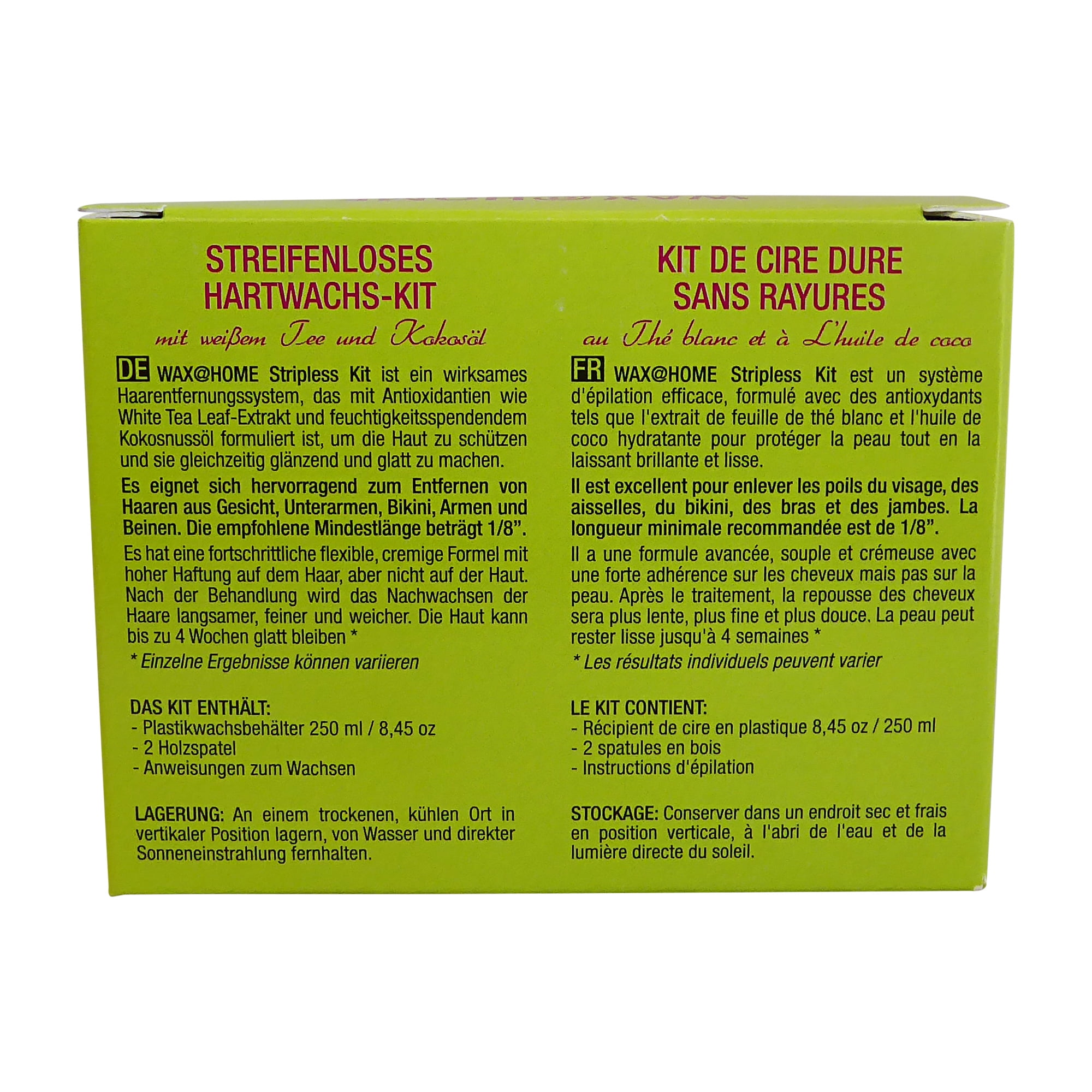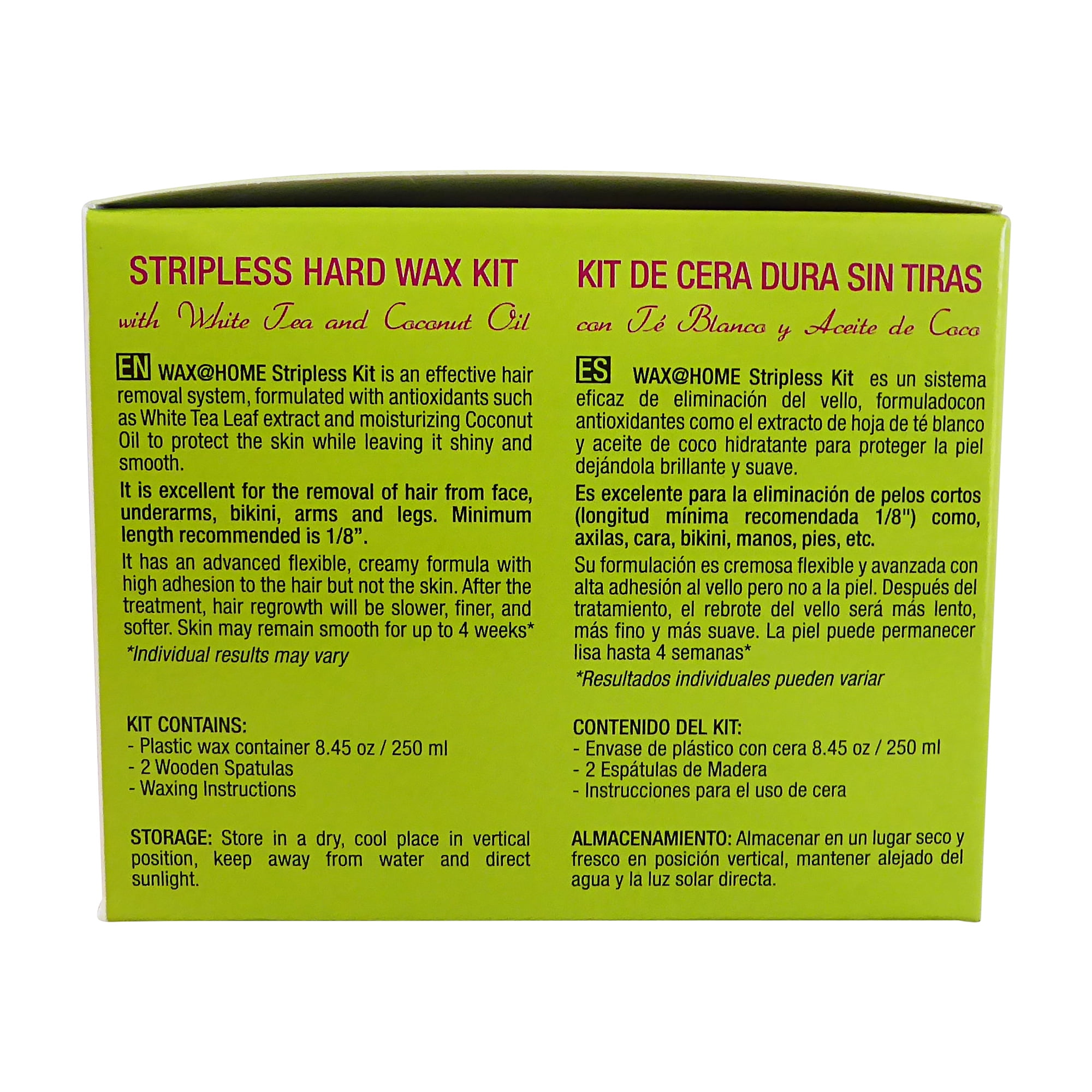 Wax at Home Stripless Kit is an effective hair removal system, formulated with antioxidants such as White Tea Leaf extract and moisturizing Coconut Oil to protect the skin while leaving it shiny and smooth.