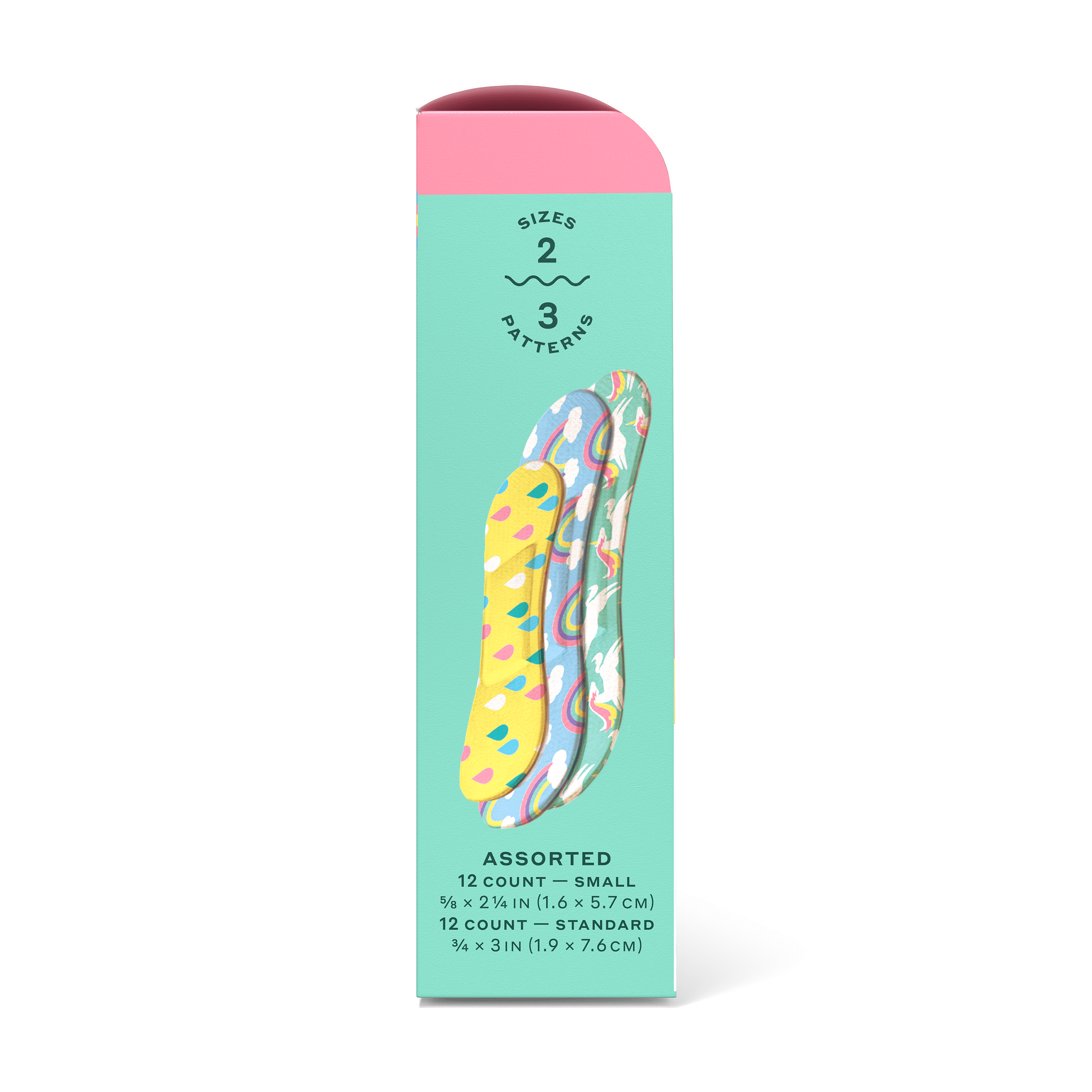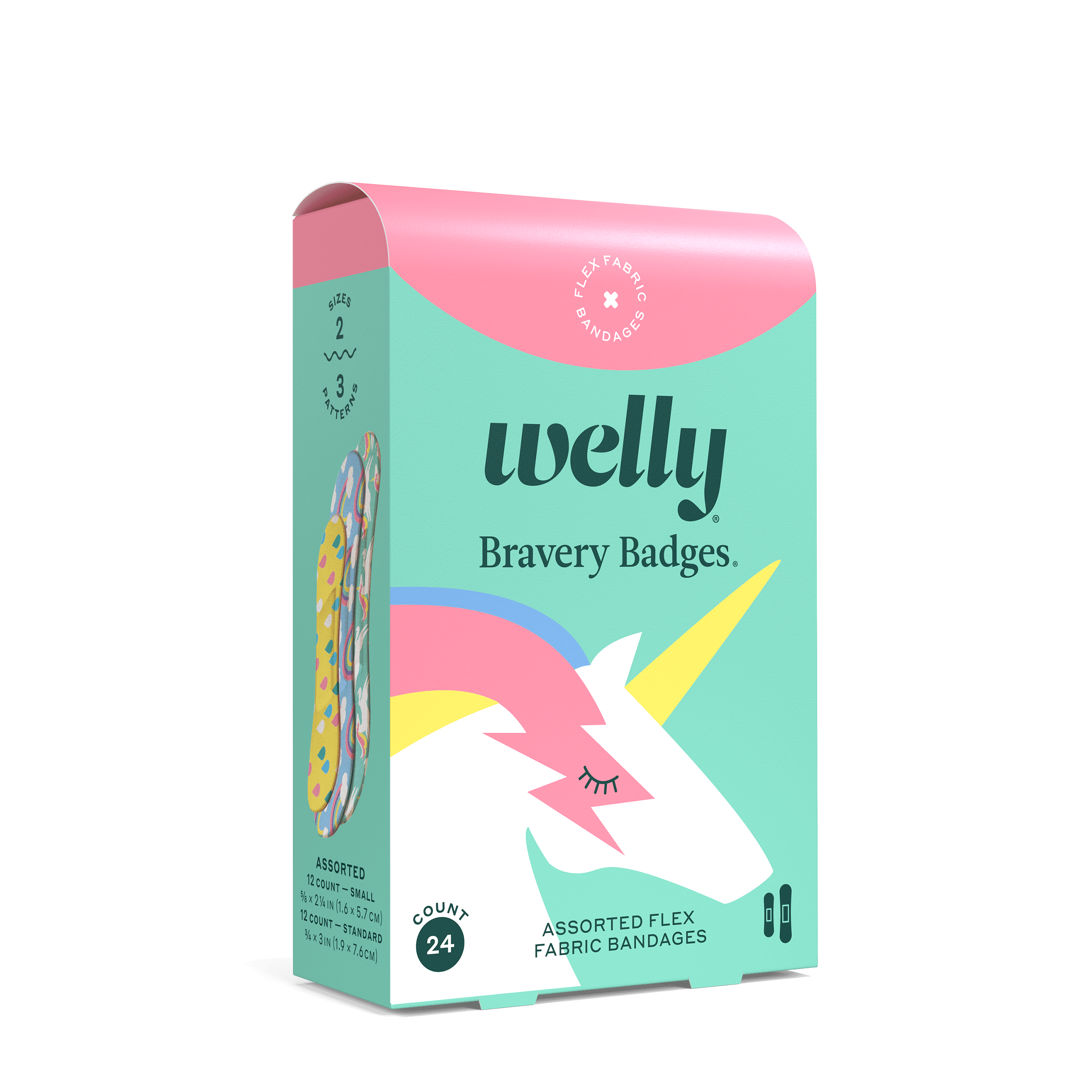 Refill your Welly tins to keep you stocked and ready to go. This pack of Bravery Badges Refill includes 24 fabric bandages in two assorted sizes. Our bandages keep you protected and prepared for anything that comes your way. The bandage seals on all four sides to keep out germs and dirt. When you’re ready for anything, everything is possible.