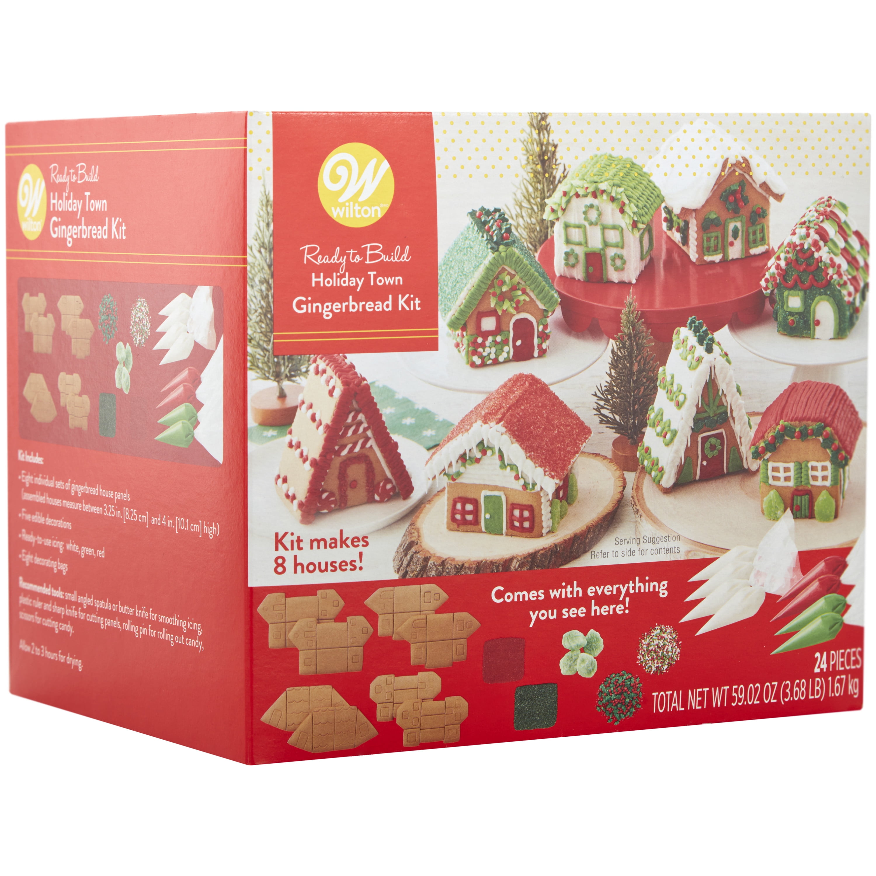 - Christmas gingerbread kit includes 24 total pieces: eight individual sets of gingerbread house panels; five edible decorations (holly sprinkle mix; white, red and green nonpareils mix; green mint gummy leaves; green sanding sugar; red sanding sugar); white, green and red ready-to-use icings; and eight decorating bags