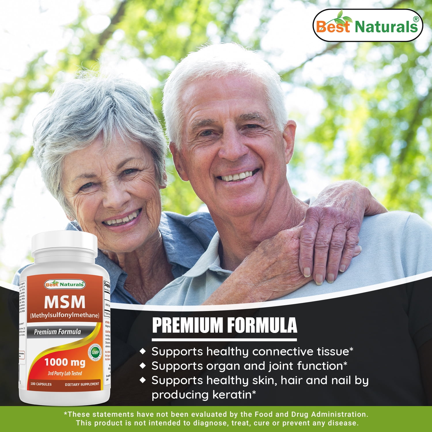 What is MSM?Methylsulfonylmethane (MSM) is a natural sulfur compound that helps support healthy joint function.How Does It Work?MSM supports organ and joint function by donating sulfur for the maintenance of healthy connective tissue. MSM helps keep skin, hair, and nails healthy by donating sulfur for the production of keratin, a fibrous proteinBenefits of Best Naturals MSM-Maintains Healthy Connective Tissue- Supports joint health- Exceptional quality at an extraordinary value.- Dietary SupplementQuality Guaranteed: GMP Certified Products- Best Naturals’ commitment to the highest standards of product quality and efficacy are evident throughout our entire product development process. As a continued measure of quality, all ingredient suppliers are required to provide a Certificate of Analysis for each raw material they supply, and each ingredient is verified for purity through in-house or independent laboratory testing. To reduce any chance of physical, chemical, or microbiological contaminants, Best Naturals has implemented a strict set of FDA compliant manufacturing procedures to ensure product integrity, including daily inspections of all storage, blending, and production areas.
