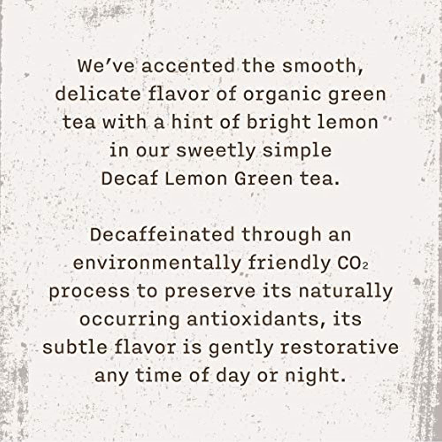 Weâve accented the smooth, delicate flavor of organic green tea with a hint of bright lemon in our sweetly simple Decaf lemon green tea. Decaffeinated through an environmentally friendly CO2 process to preserve its naturally occurring antioxidants, its subtle flavor is gently restorative any time of day or night.