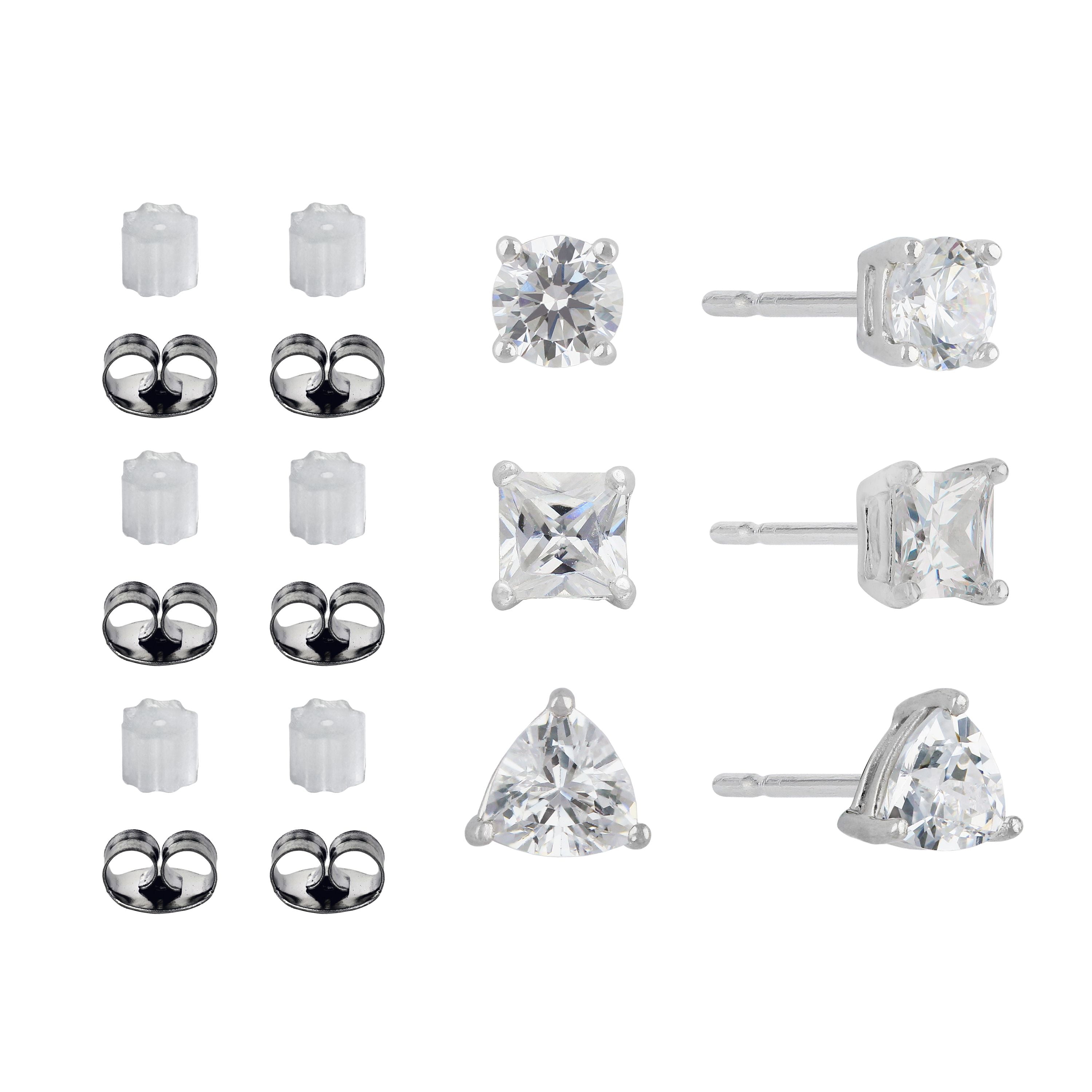 This beautiful ladies Brilliance Fine Jewelry sterling silver simulated diamond earring set is a perfect addition to your collection and makes an ideal gift for loved ones. This three pair earring set includes simulated diamond studs in 4mm round shape, 4mm square, 5mm trillion shape stud earrings.