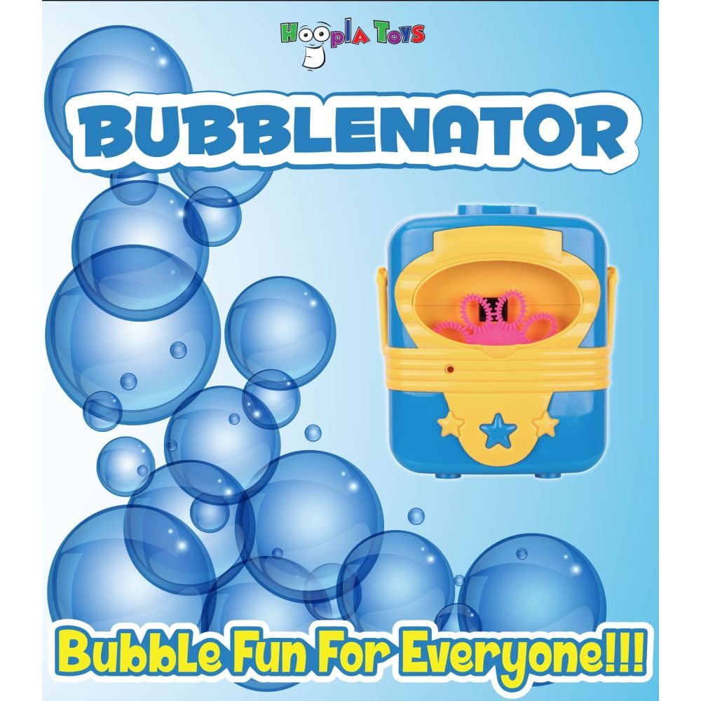 Hoopla Toys presents in all its wonder the original Bubblenator! Simply load up with your favorite bubble solution, turn it on, and sit back and enjoy. Blows countless bubbles for hours of bubble fun! It works with all bubble solutions and is great fun for the whole family. One 4.5 oz bottle of solution is included for fun straight out of the box! Perfect for kids birthday parties or get-togethers! Bubblenator has a convenient handle so you can make bubbles on the move as well. Runs off of three AA batteries. Batteries are not included. To clean simply rinse with warm water and let air dry. Overall dimensions are 5.69" x 5.11" x 3.3"