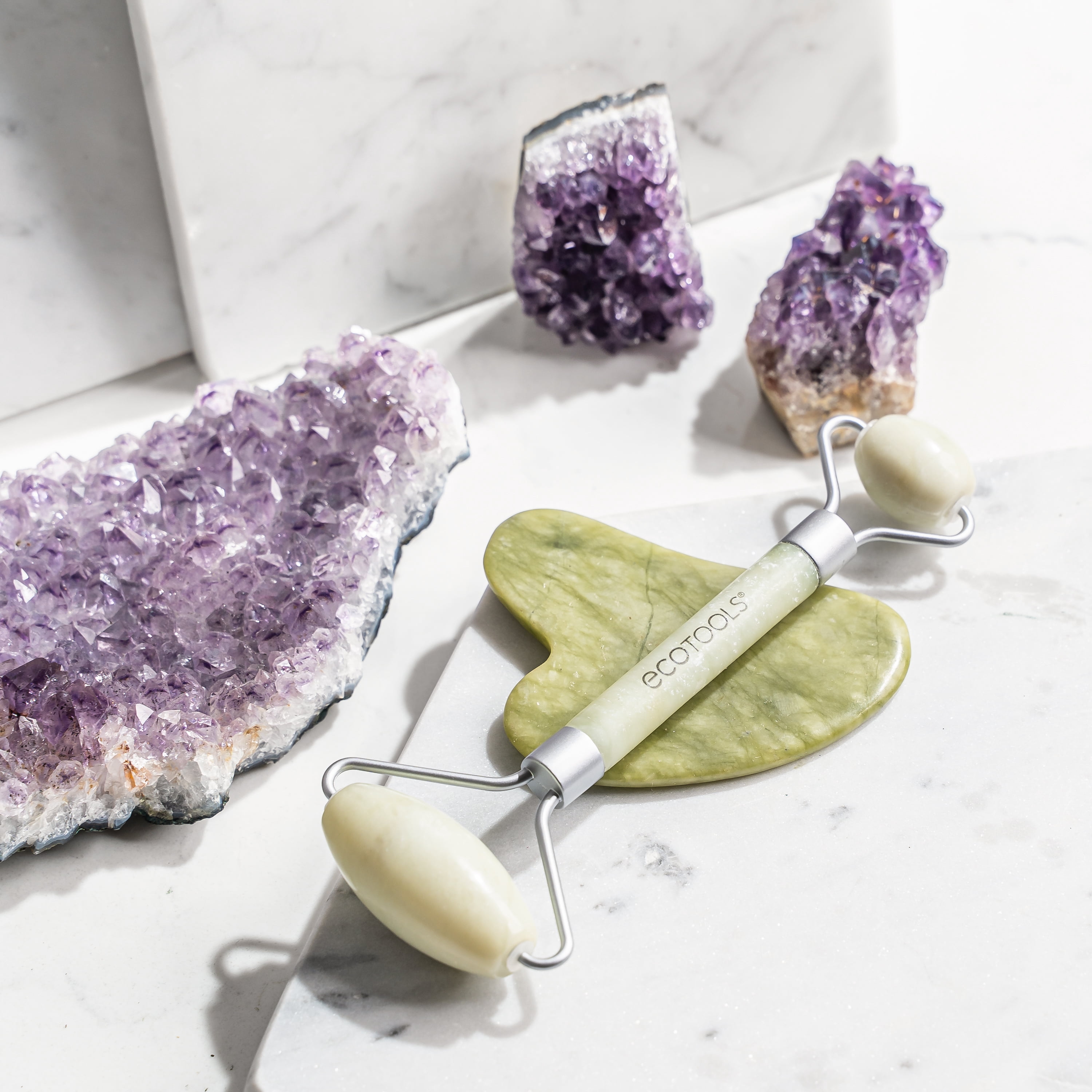 The EcoTools Jade Roller and Gua Sha Stone Duo Pack Mini Facial Kit is made with 100% Jade and designed to help reduce puffiness and smooth skin. Use the Jade Roller and Gua Stone to invigorate and revive skin by using a gentle massaging motion. For an extra cooling and refreshing feel, store in the refrigerator to help depuff, or run under warm water and use warm to help open pores.