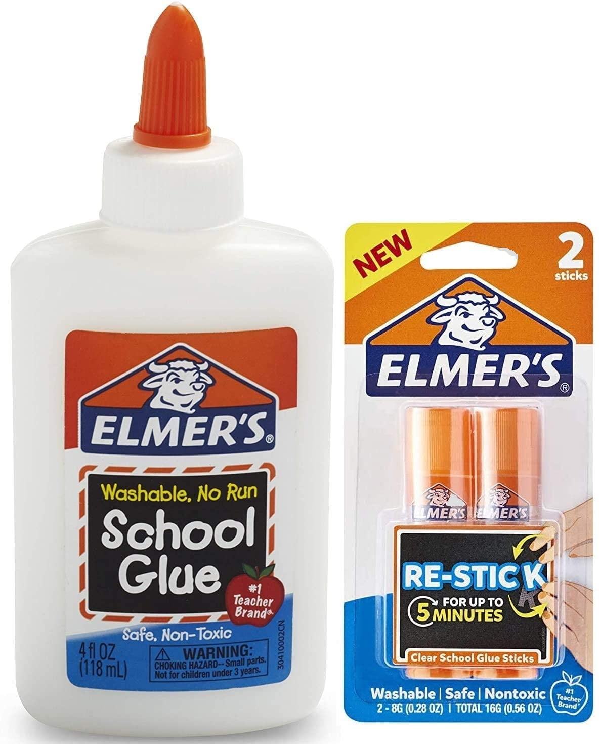 3 pack 4 0z school glue and 2 restick glue Ideal for younger learners, making poster presentations, crafting and more School glue sticks apply smoothly and dry clear for a mess-free appearance Non-toxic, washable and photo-safe formula makes it great for classrooms and homesElmer’s Bundle Washable Liquid School Glue, White, Dries Clear, 4 fl oz Plus re-Stick Elmer’s School Glue Stick, 8g, 2pk