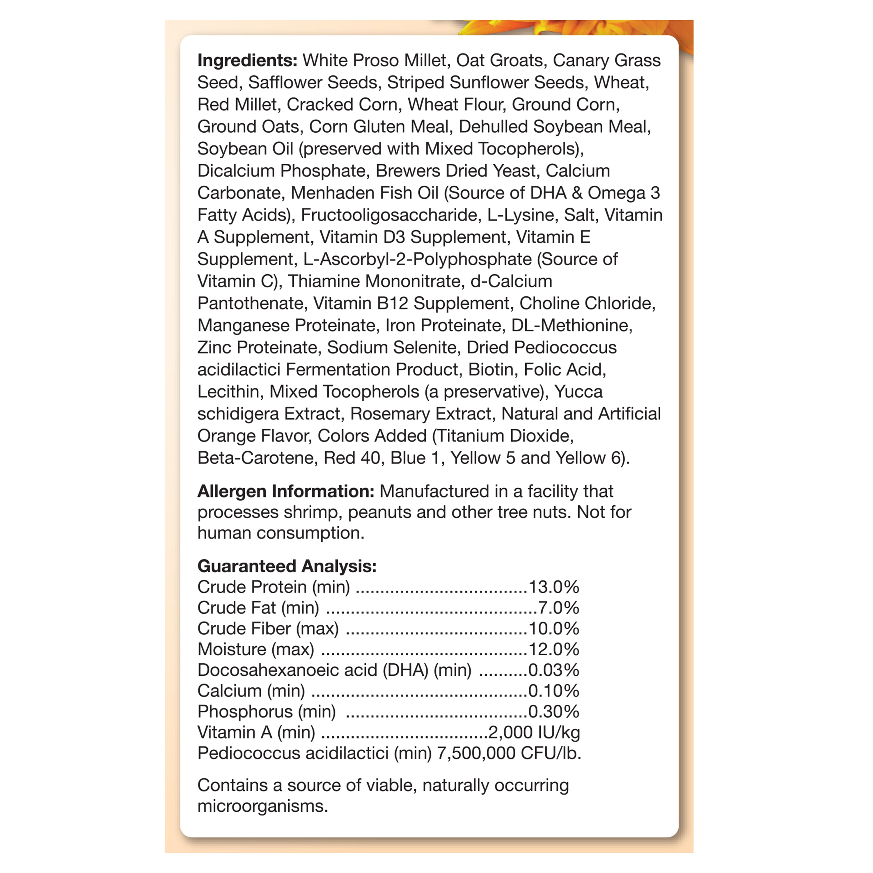 Encore Premium, a premium, vitamin-fortified food that is formulated to provide the proper nutrition your pet requires. We’ve blended the highest quality select seeds and grains together and topped it off with our colorful, vitamin-packed food shapes that make feeding time exciting, tasty, healthy and fun. Ingredients: White Proso Millet, Oat Groats, Canary Grass Seed, Safflower Seeds, Striped Sunflower Seeds, Wheat, Red Millet, Cracked Corn, Wheat Flour, Ground Corn, Ground Oats, Corn Gluten Meal, Dehulled Soybean Meal, Soybean Oil (preserved with Mixed Tocopherols), Dicalcium Phosphate, Brewers Dried Yeast, Calcium Carbonate, Menhaden Fish Oil (Source of DHA & Omega 3 Fatty Acids), Fructooligosaccharide, L-Lysine, Salt, Vitamin A Supplement, Vitamin D3 Supplement, Vitamin E Supplement, L-Ascorbyl-2-Polyphosphate (Source of Vitamin C), Thiamine Mononitrate, d-Calcium Pantothenate, Vitamin B12 Supplement, Choline Chloride, Manganese Proteinate, Iron Proteinate, DL-Methionine, Zinc Proteinate, Sodium Selenite, Dried Pediococcus acidilactici Fermentation Product, Biotin, Folic Acid, Lecithin, Mixed Tocopherols (a preservative), Yucca Schidigera Extract, Rosemary Extract, Natural and Artificial Orange Flavor, Colors Added (Titanium Dioxide, Beta-Carotene, Red 40, Blue 1, Yellow 5 and Yellow 6). Guaranteed Analysis: Crude Protein (min) 13.0% Crude Fat (min) 7.0% Crude Fiber (max) 10.0% Moisture (max) 12.0% Calcium (min) 0.10% Phosphorus (min) 0.30% Vitamin A (min) 2,000 IU/kg Docosahexanoeic acid (DHA) (min) 0.03% Pediococcus acidilactici (min) 7,500,000 CFU/lb.Encore Premium Cockatiel Food, 8 lb.
