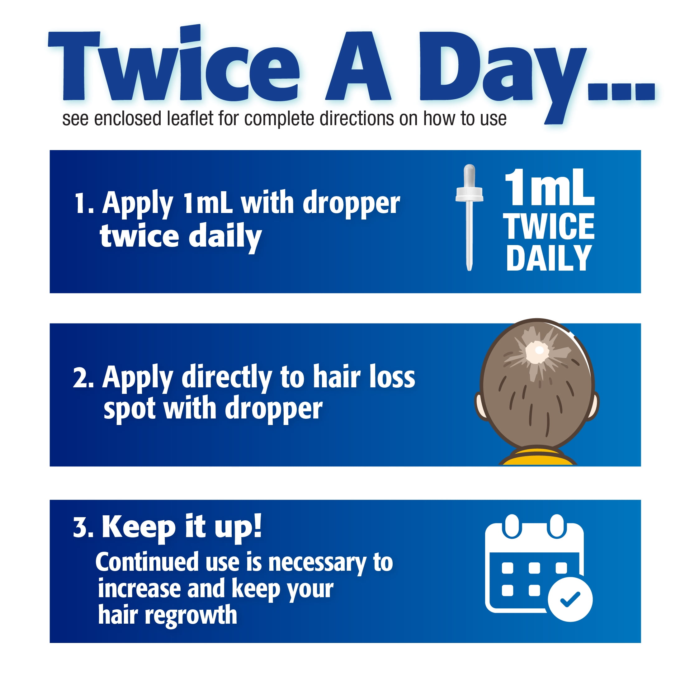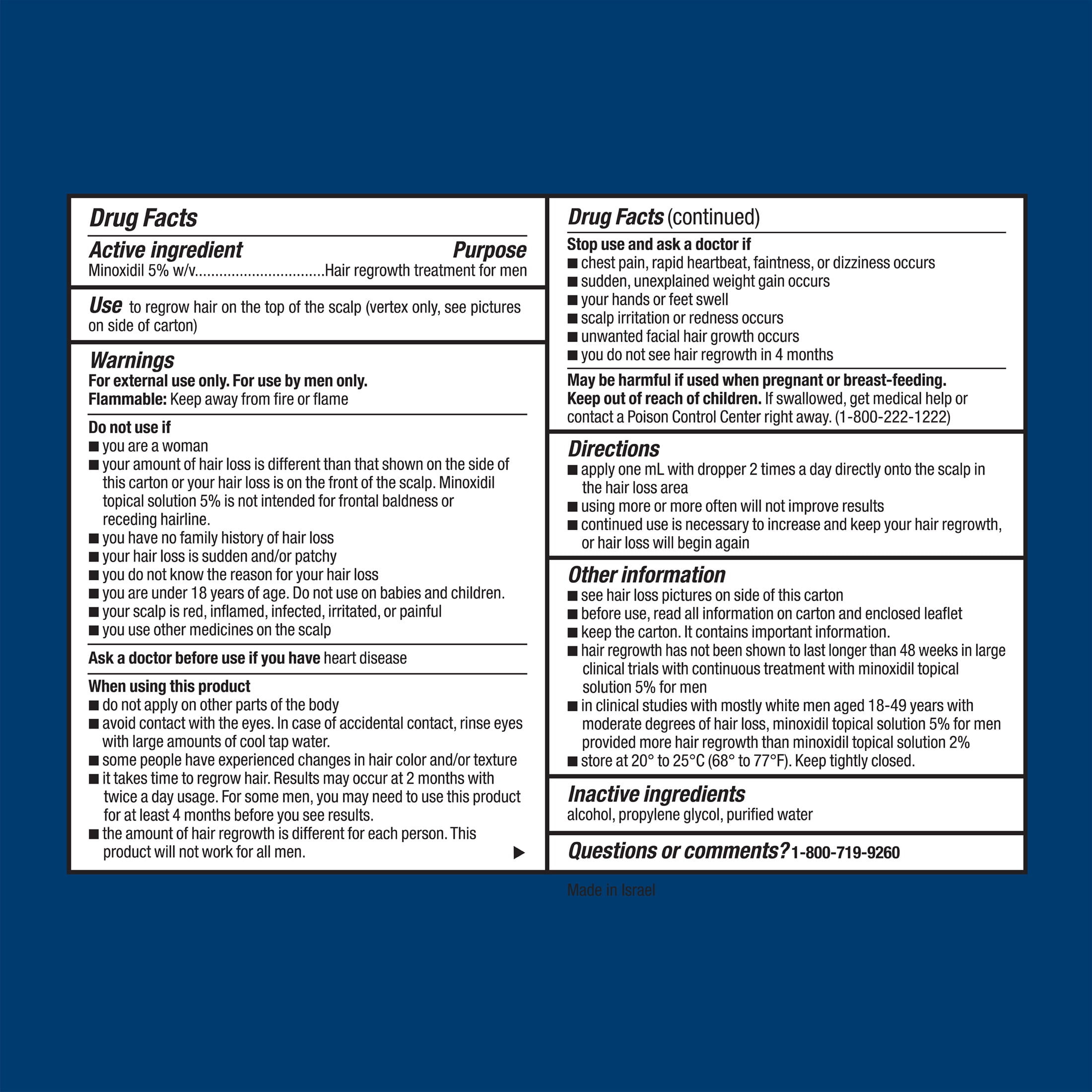 Compare to Men’s Rogaine Extra Strength active ingredient. Don’t let male pattern baldness get you down. Equate Minoxidil Topical Solution 5% Hair Regrowth Treatment for Men is a topical hair loss treatment for use only on the scalp to help regrow hair in men who have hair loss or thinning hair that begins on the vertex of the scalp. This hair regrowth treatment is an unscented, easy-to-use solution that revitalizes hair follicles to stimulate regrowth and is clinically proven to help regrow hair. Equate Minoxidil Topical Solution 5% Hair Regrowth Treatment for Men contains the #1 dermatologist recommended OTC hair regrowth treatment active ingredient (Of U.S. Physicians surveyed by an independent market research firm). For men who have a general thinning of hair on the top of the scalp. Women should not use Equate Minoxidil Topical Solution 5% Hair Regrowth Treatment for Men. It takes time to regrow hair. Results may occur at 2 months with twice a day usage. For some men, you may need to use this product for at least 4 months before you see results. If you experience hair regrowth, continued use of Equate Minoxidil Topical Solution 5% Hair Regrowth Treatment for Men is necessary or the hair loss will begin again. Not intended for frontal baldness or receding hairline.