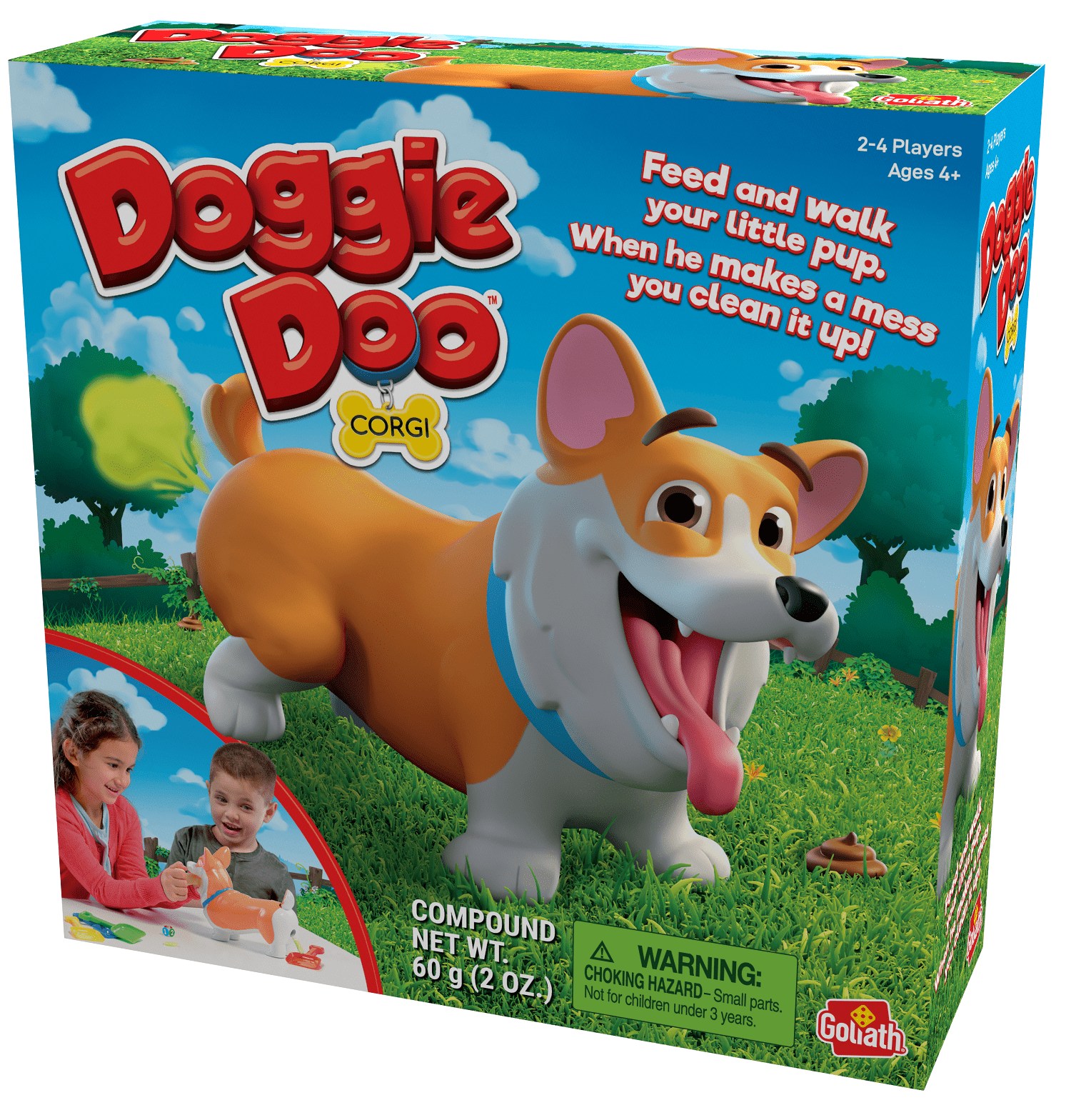 It’s the dog that doos – Corgi style! Don’t be fooled – this adorable little dog packs a poopy punch! Feed your Corgi, and then squeeze his turkey bone. After he makes some gross gassy sounds – plop! Don’t forget to clean up! Be the player with the most doos when the food is gone to win! Includes 1 Doggie, 1 Bone Pump, 4 Shovels, 2 Bags of "Dog Food," 1 Die, 1 Sticker Sheet, 1 Plunger and Complete Instructions. Goliath Doggie Doo Corgi is for 2-4 players, ages 4 and up.