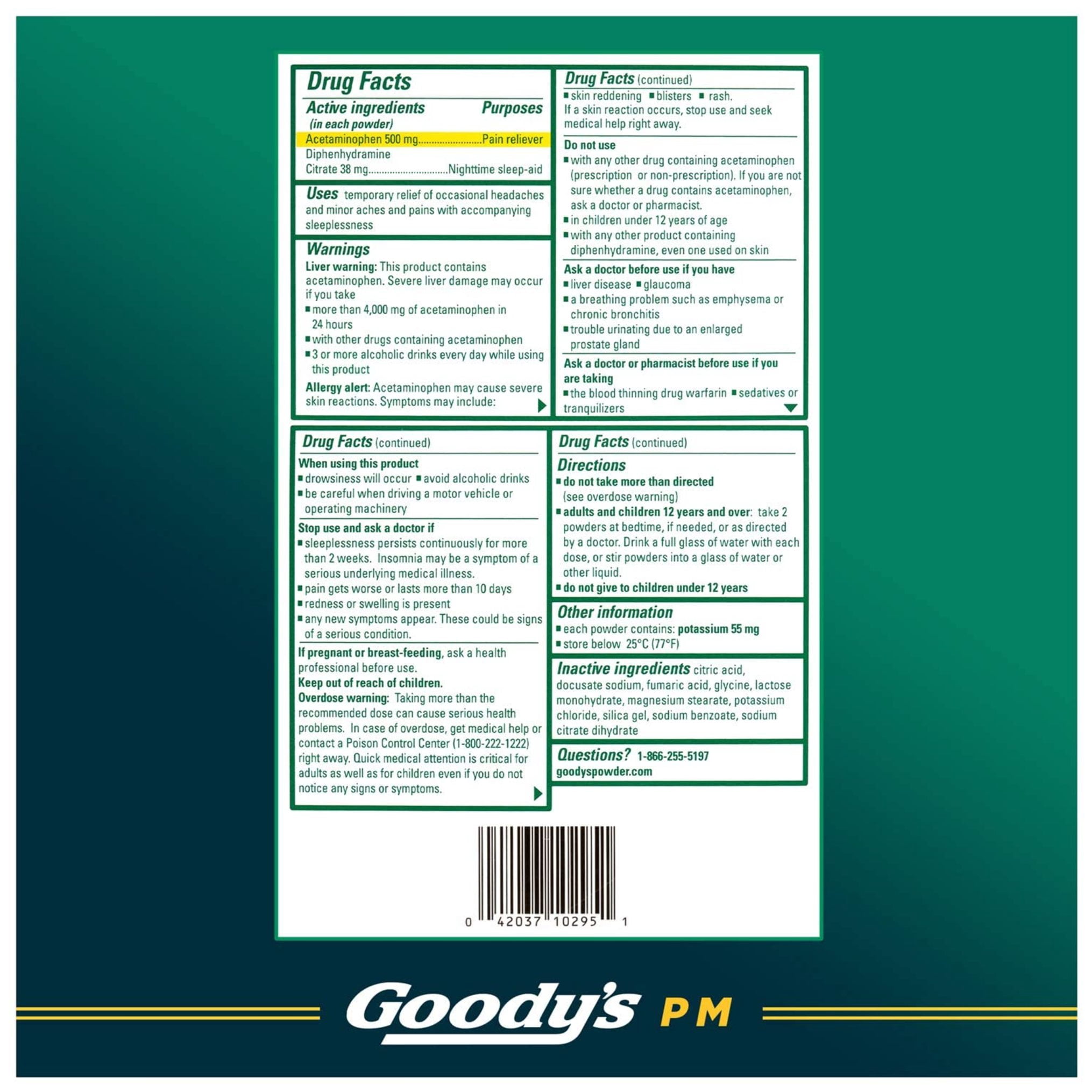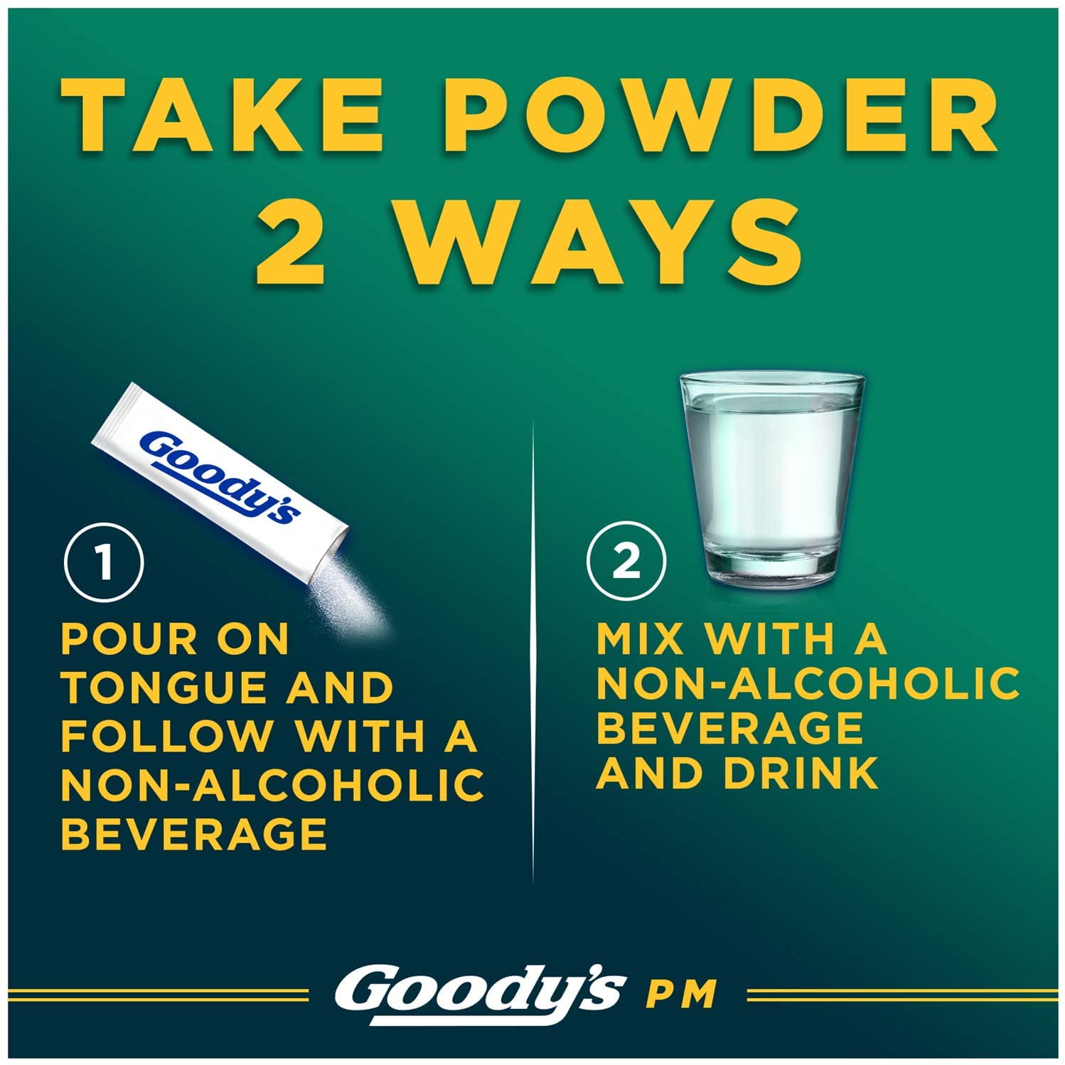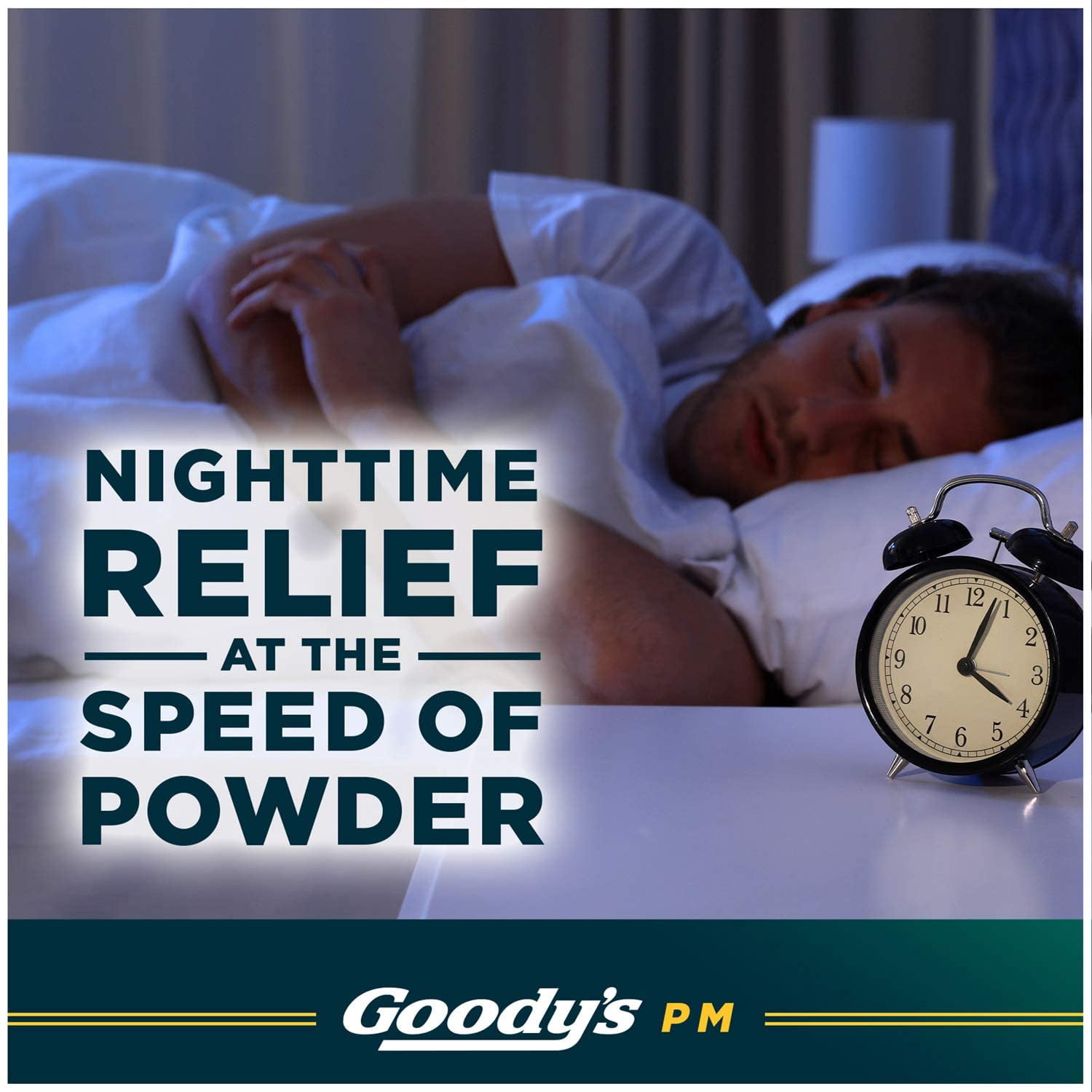 - Contains 1 box of Goody’s PM for Pain with Sleeplessness Nighttime Powder, 16 stick powders; for use by adults and children 12 years and older