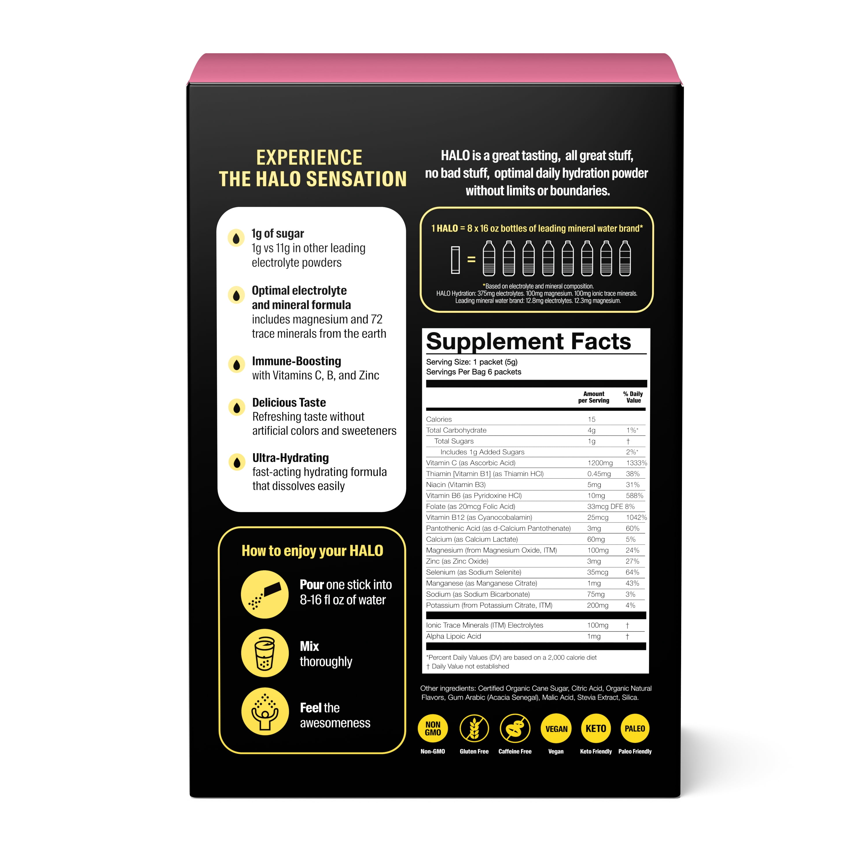 Advanced efficient hydration with our signature refreshing taste, HALO Hydration Sticks are perfect for combating dehydration on-the-go with only 15 calories and 1g of sugar per stick. Our electrolyte powder sticks are packed with our signature hydration trinity: