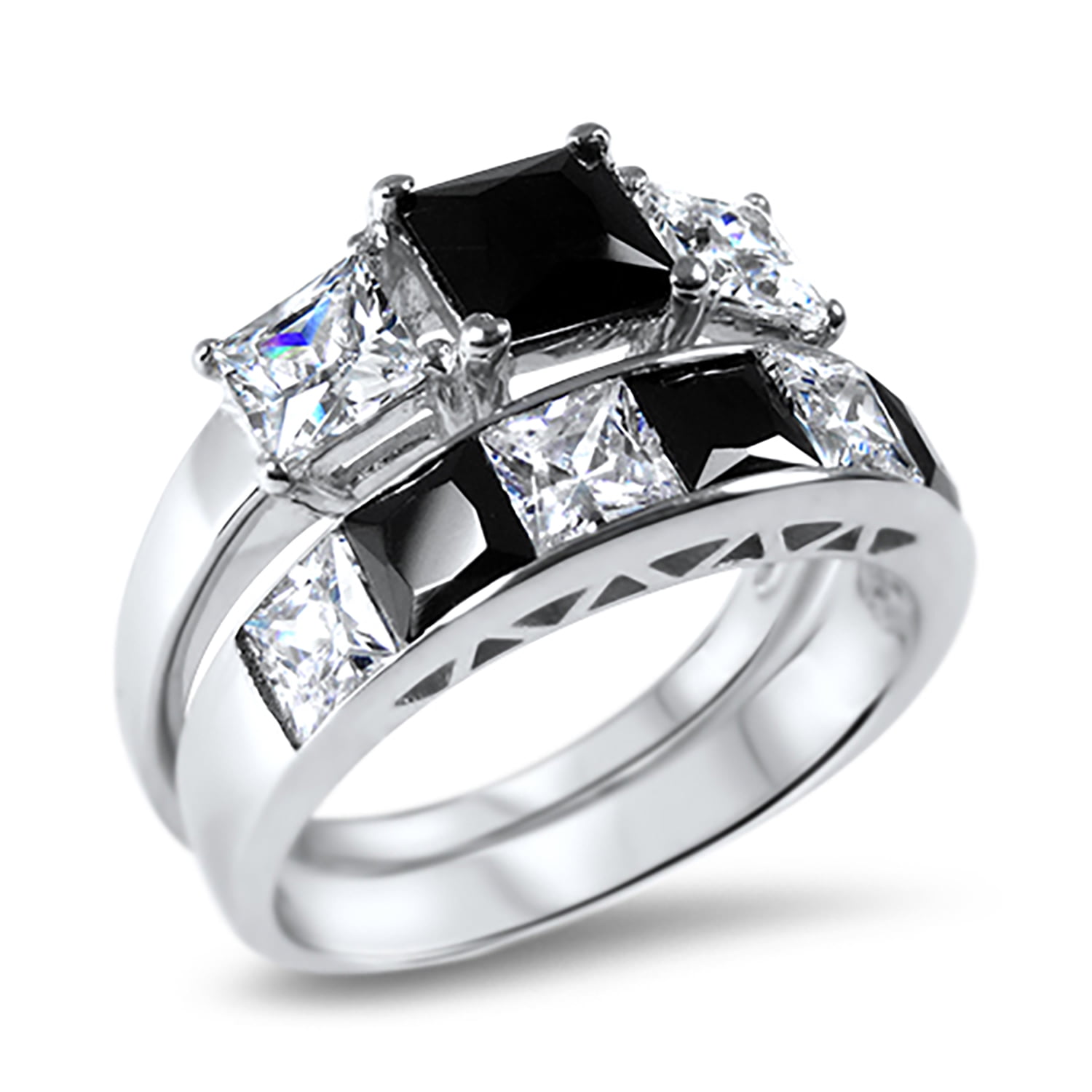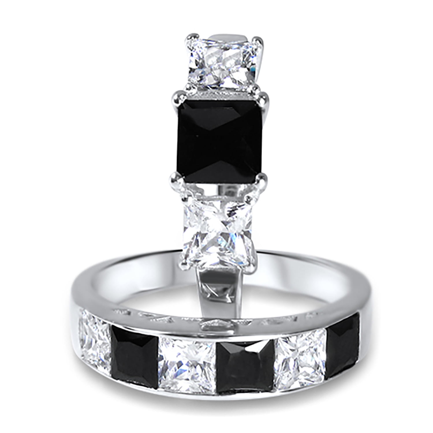 Her CZ wedding ring set is a two ring matching bridal set with a simulated Diamond center stone set in a vingage infinity halo setting. The engagement ring features a 1 carat princess cut square simulated black diamond stone with bright white simulated diamond side stones.