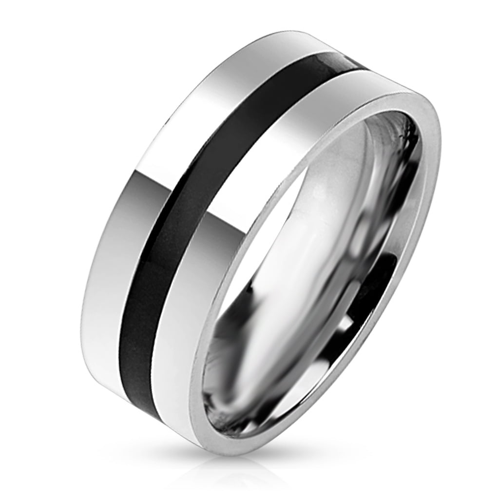 The men’s wedding band is a 6 millimeter wide 316L stainless steel band with a black line in the center of the wedding ring.
