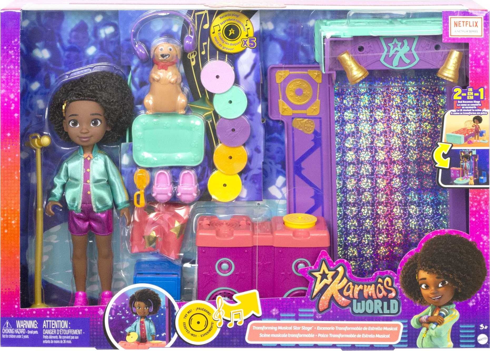 - Fans of Karma’s World can help Karma doll make her rap star dreams a reality with this 2-in-1 Transforming Musical Star Stage playset!