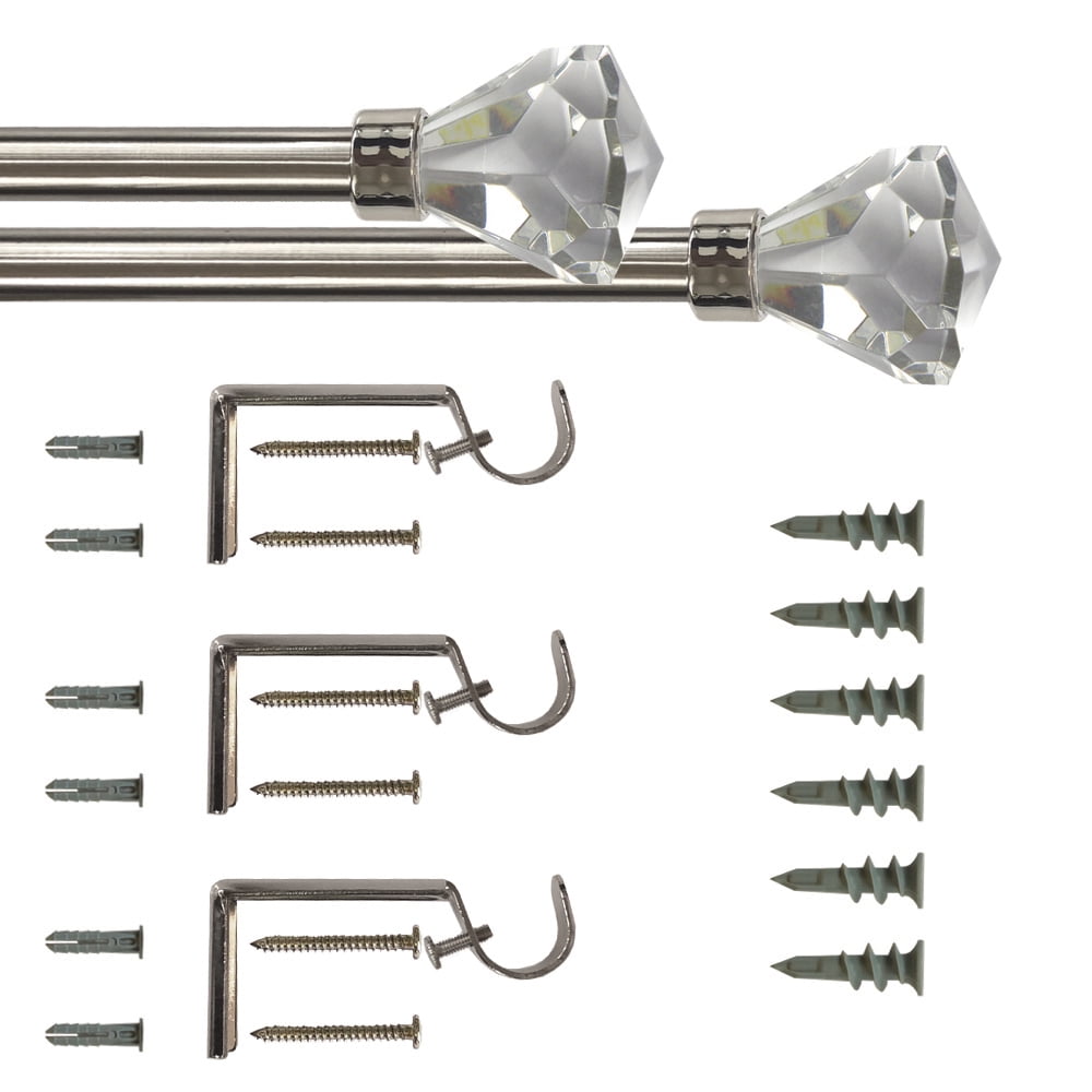 This beautiful Mainstays rod set, with its crystal-clear faceted finials, will will add a touch of sparkle to any room of the home. The sturdy steel rod and brackets will support curtains panels of various weights, from light-weight sheers to heavier weight blackout curtain panels. Rod telescopes for windows from 30 inches to 84 inches wide, for the perfect fit over your window. Brackets will project 3 inches from a wall. Instructions included for easy installation. For hollow drywall, our self-drilling anchors require no power drill to install. The lustrous nickel rod finish will complement color or style of window curtain.