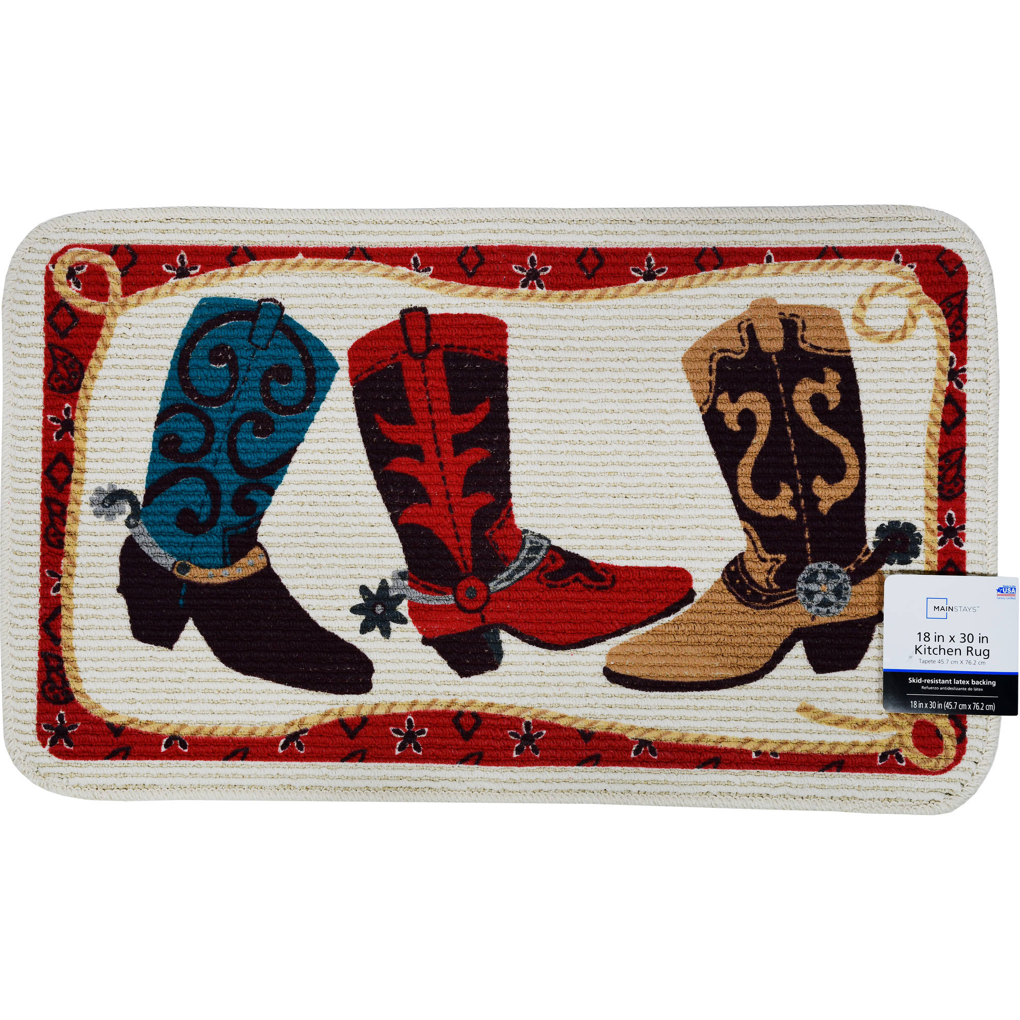 Howdy partner! The Mainstays Boots & Bandana Kitchen Rug, in size 18" x 30" is the perfect mat for any western or rodeo fan! This colorful and playful rug is perfect to stand on while doing dishes, prepping meals or adding to an entry way space. Made out of 100% stain-resistant olefin yarn and a latex backing, this mat is durable, low pile and easy to clean by spot cleaning using a solution of mild detergent and cold water.