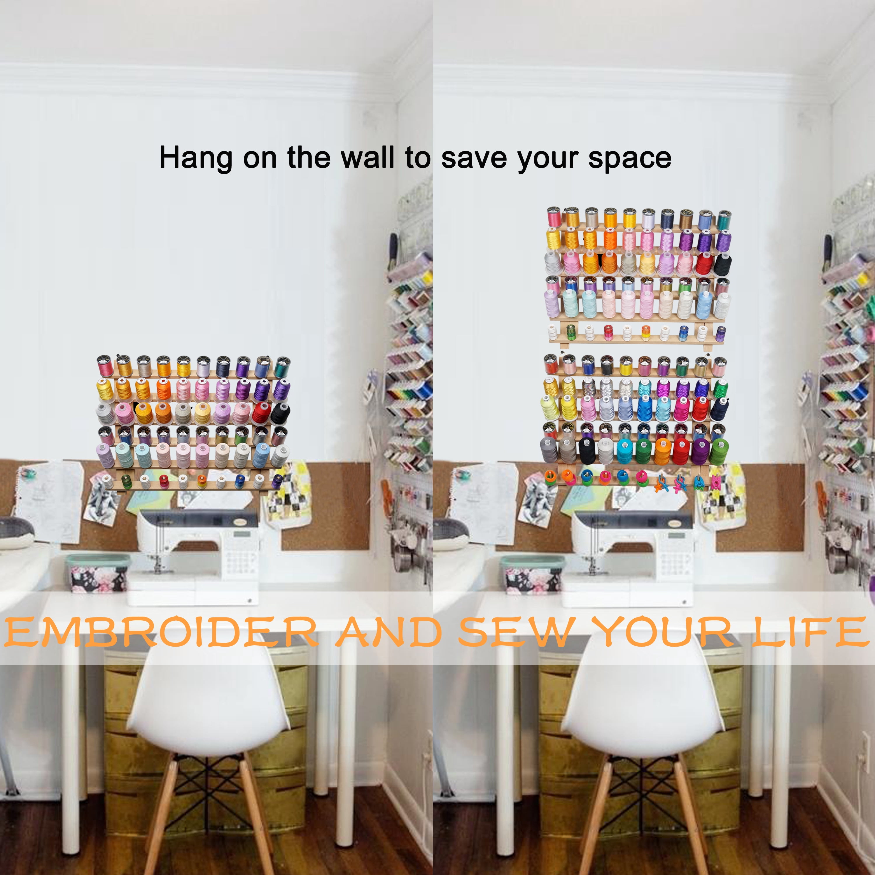 - √ Can be free-standing or mounted on the wall: This wooden thread rack is designed with two folded legs. You can easily pull the legs out and let it stand freely on your table or fold the legs back for easy storage. In order to saving space, we have designed two hooks on back of the rack, you can hang this thread rack on the wall.