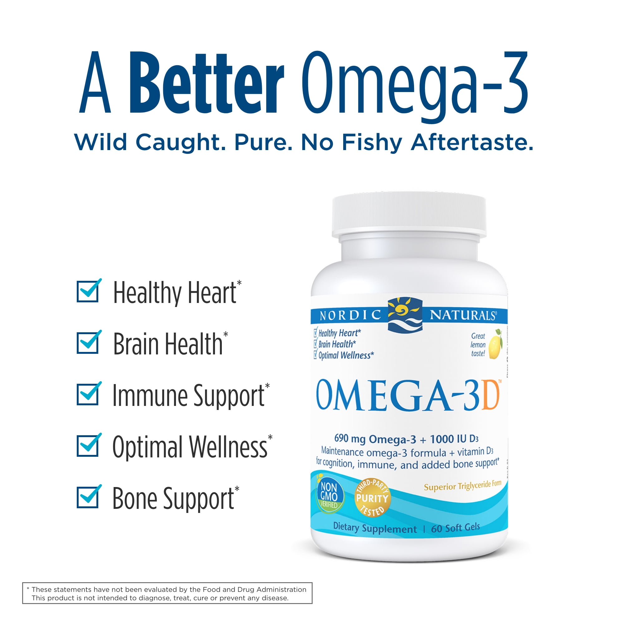 In addition to all the benefits of our Omega-3 formula, offering 690 mg of naturally concentrated omega-3s, each serving of Omega-3D includes 25 mcg (1000 I.U.) of vitamin D3, meeting the daily recommendation for children and adults who do not receive adequate sun exposure. Vitamin D3 is the natural form of vitamin D produced by the body, and is better absorbed and utilized than other forms. This powerful formula offers combined support for a healthy heart and brain, bones, mood, and immunity.*