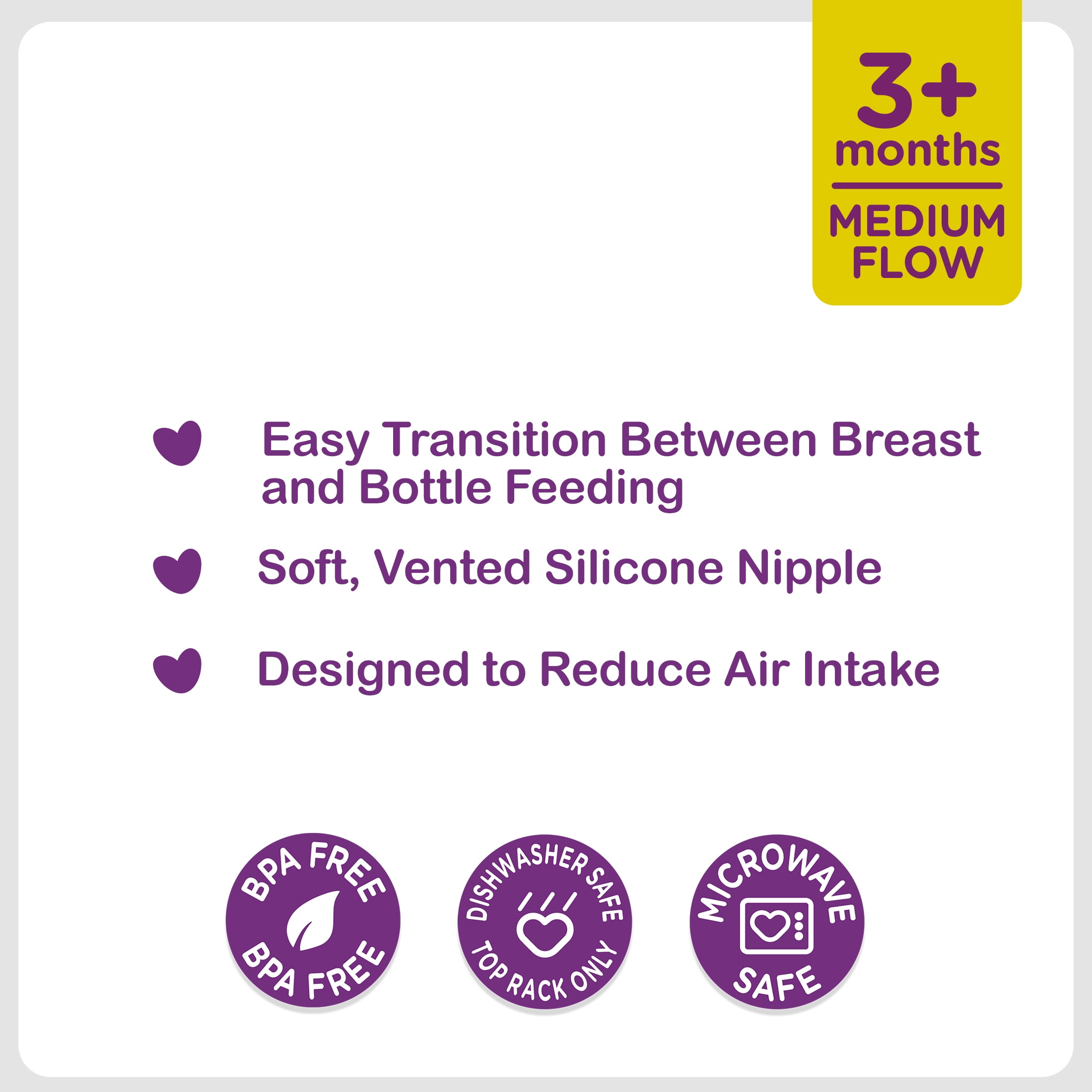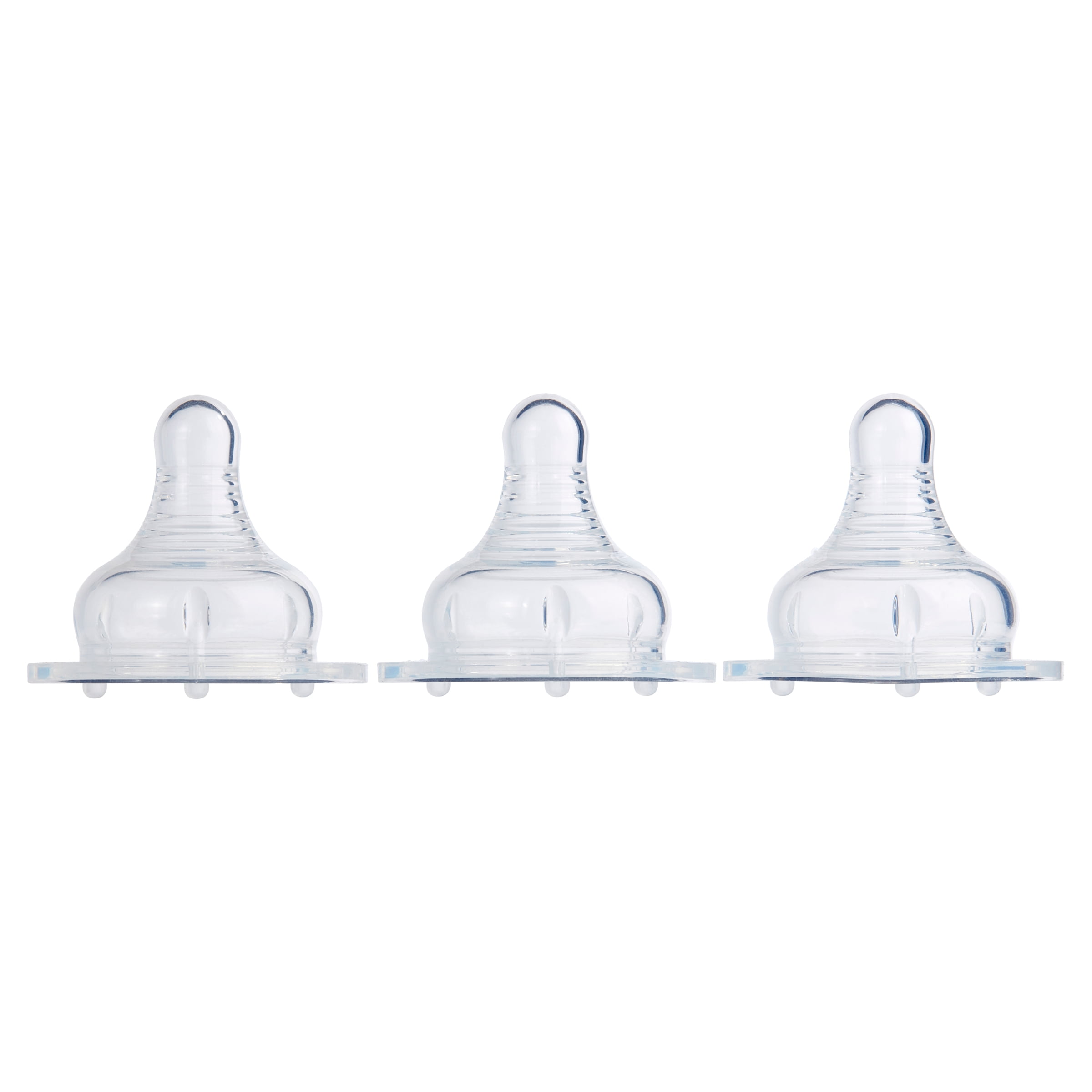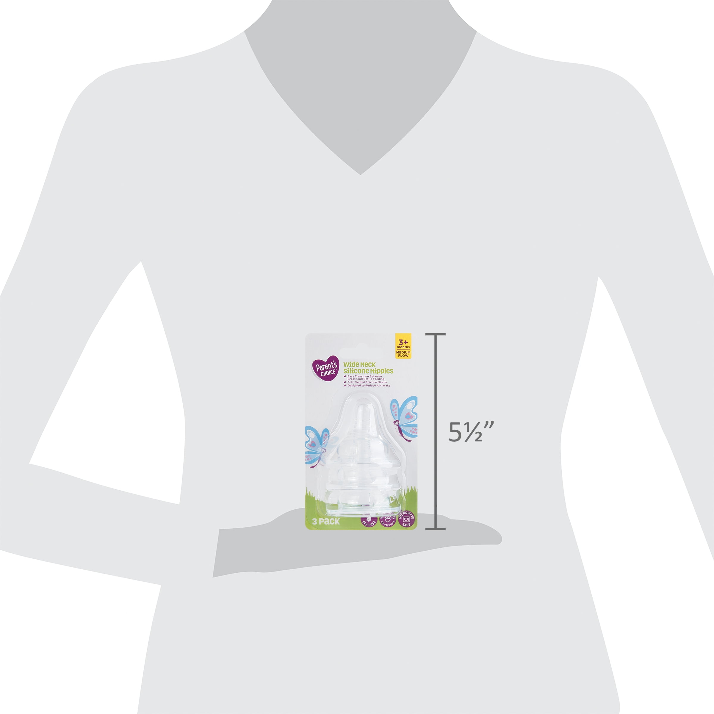 Parent’s Choice Wide Neck Silicone Nipples, 3+ Months, Medium Flow are the natural way to bottle feed your growing baby. Ideal for babies 3 months or older, these medium flow nipples are great for transitioning between the breast and the bottle. The wide neck has a broader base, which can help your infant avoid nipple confusion. These vented nipples reduce air intake to minimize colic, gas, and spit-up. The soft silicone provides greater comfort for your little one’s mouth and conforms to baby’s palate for a wonderful feeding experience. Our silicone nipples support nursing and bottle-fed babies with a shape that promotes a superior seal between the baby and the nipple. They are made without the use of harmful materials such as BPA. The nipples in this convenient 3-pack are dishwasher and microwave safe. For a supportive style of bottle feeding, Parent’s Choice Wide Neck Silicone Nipples are the natural choice. Parent’s Choice provides parents with baby and toddler products you need at a price that won’t push your budget over the edge. We offer everything you need from bath time to bed time and every time in between, all with the high quality we know your little one needs.