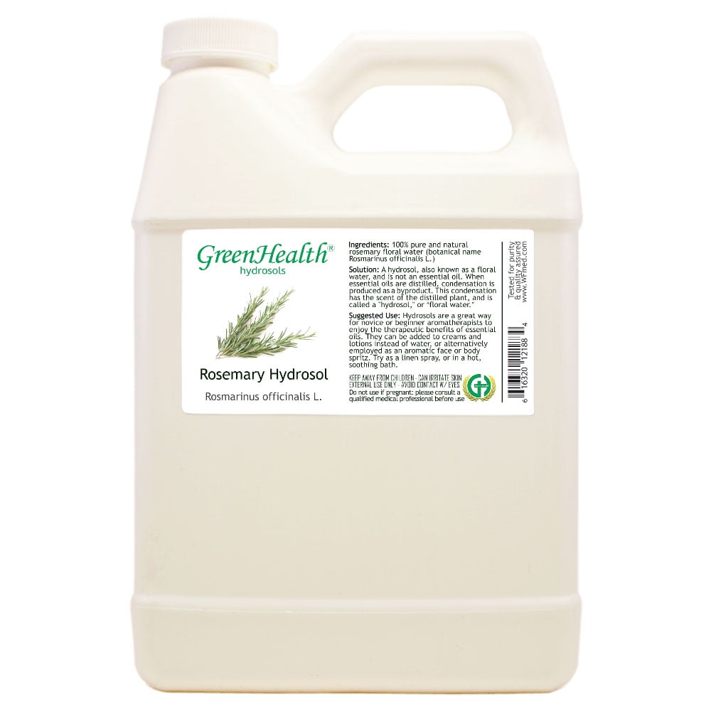 ROSEMARY HYDROSOL – 100% NATURAL FLORAL WATER! PRODUCT INFORMATION Hydrosol Name: Rosemary Hydrosol This is a hydrosol, a floral water. This is not an essential oil. When essential oils are distilled, water condensation is produced as a byproduct. This condensation has the scent of the plant, and is called a "hydrosol." Hydrosol color can vary from yellowish clear, to fully clear. Botanical Name: Rosmarinus officinalis L. Origin: Canada Description: Our hydrosols (floral waters) are free of emulsifying agents and preservatives. Imported internationally, these waters are extremely versatile. They can be used in the manufacturing process anywhere that water is required. They are an excellent linen spray, and a simple way for the novice aromatherapist to enjoy the therapeutic benefits of essential oils. Add to a soothing hot bath. Safety Information: For external use only. May cause skin irritation for those with sensitive skin. Disclaimer: Please note, the International Federation of Aromatherapists do not recommend that Essential Oils, Carrier Oils, or Hydrosols be taken internally unless under the supervision of a Medical Doctor who is also qualified in clinical Aromatherapy.Rosemary Hydrosol – 32 fl oz – White Plastic Jug w/ Cap – GreenHealth
