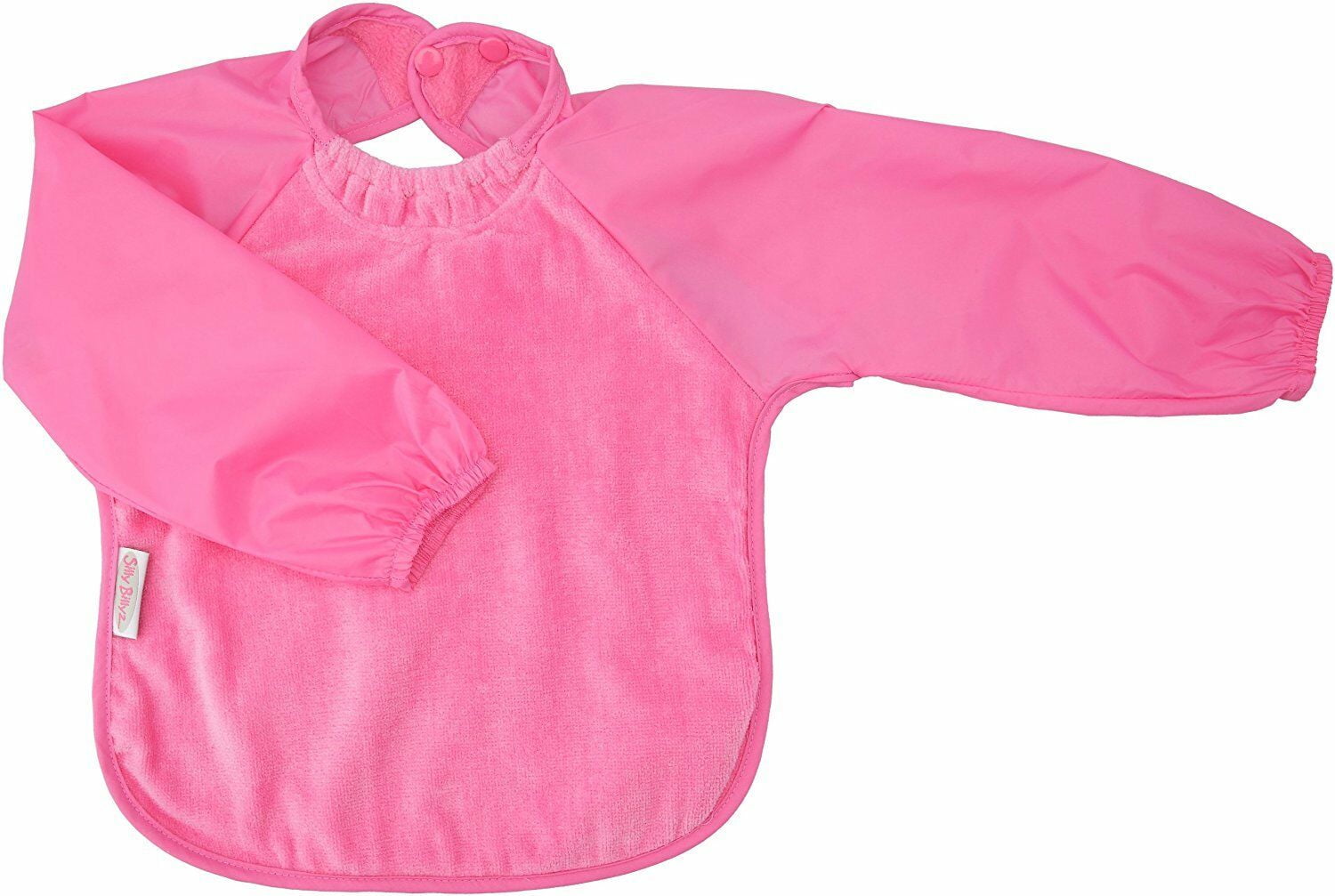 The Silly Billyz long sleeve bibs are now available in cotton toweling with snuggle neck! The ultimate in protection for your baby eating solids and self feeding. Made from high quality cotton velour and backed with waterproof nylon to protect against leaking. The nylon sleeves keep those expensive clothes from getting ruined. The open back keeps your child cool. All Silly Billyz bibs are PVC and Lead free. They feature a two position snap closure for adjustable comfort. Snap closures are more secure and last longer than hook & loop closures. Silly Billyz bibs are preferred by daycare centers for their durability, wash-ability and their ability to repel stains. Available in 2 sizes Small for 6 months-2 years and Large for 12 months-3 years.