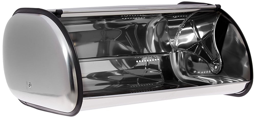 Home-it Stainless Steel Bread Box with its stylish stainless steel design keeps all your baked goods fresh and tasty. Large capacity bin lets you keep any of your baked goods from delicious french rolls to home made cookies. breadbox Brushed stainless steel design complements the rest of your stainless steel kitchen wares. Size of the box is 16" x 10" x 7".