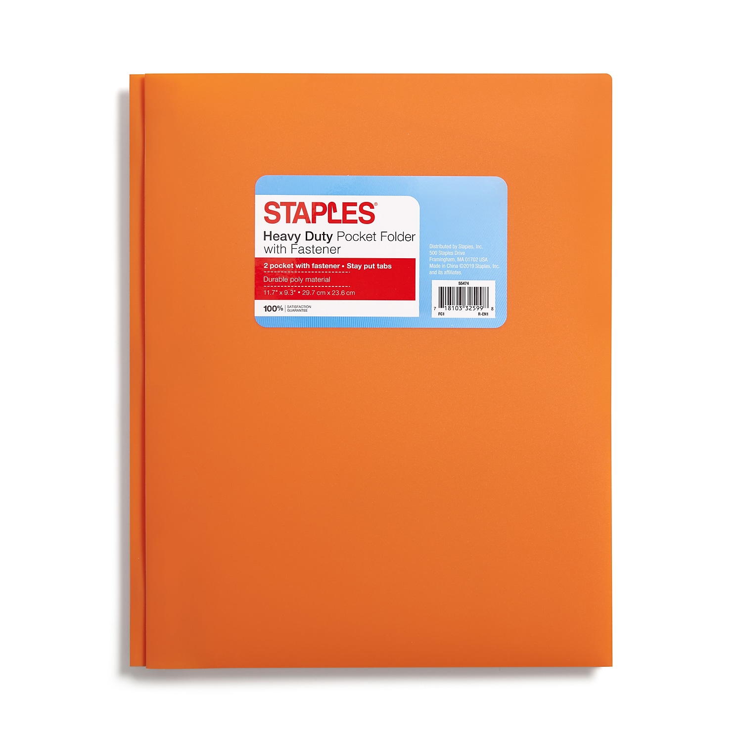Keep organized and get ready for back to school with the Staples orange 2-pocket poly portfolio. Made from durable poly material, this folder helps you organize letter-sized documents and has a convenient fastener to keep everything in place. Available in a variety of colors to match your style!. Internal pockets are three-hole punched to help keep documents secure with included fastener. Poly portfolio with fastener in orange. Sold individually. Dimensions: 9.64"" x 11.69"". Accommodates letter-sized documents. Capacity of portfolio: 20 paper sheets. Sold as 1 Each.