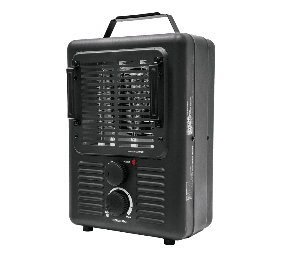 The Sunko Black 1500w Heavy Duty 2-Setting Electric Utility Space Heater with Thermostat is a perfect option, when you need supplemental heat. It heats quickly and comes with a low and a high power setting. In addition to 2 heat settings, there is also a "fan only" setting that provides a cool air flow if needed. This electric powered heater with its light weight, small size and a built-in carrying handle allows for easy transport wherever the heater is needed. This heater can be used in your garage, workshop or anywhere indoors. A light indicates when the heater is on and operating. For safety, the heater is equipped with a tip-over switch off function and an automatic shut off in the event the unit were to overheat, providing added safety and reliability. In addition two these two safety features, the heater remains cool to the touch when operating. A mechanical control and remote control are not included for simple operation. This heater is recommended for rooms up to 160 sq ft.
