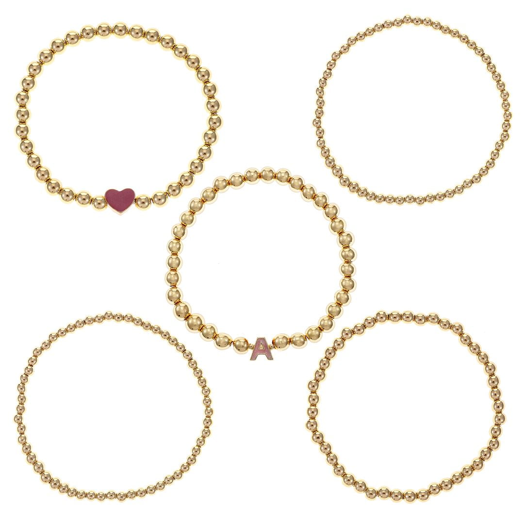 - Set includes five gold-tone beaded bracelets with ivory enameled initial "A" letter and pink heart charm