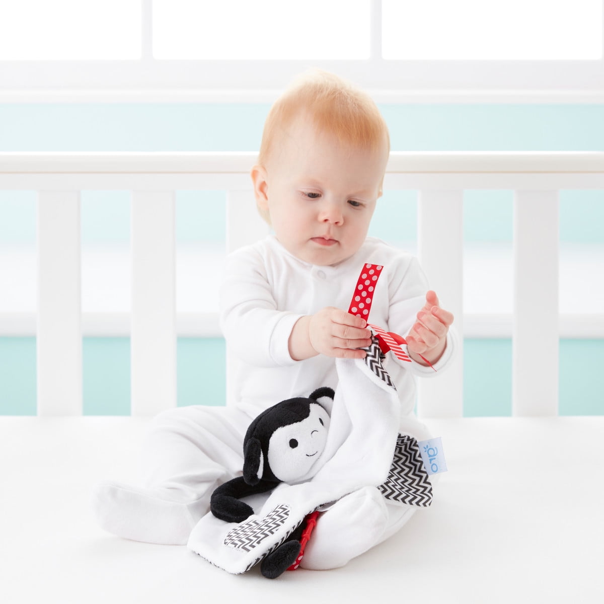 Marco is the fun little monkey security blanket to comfort your little one. The baby lovey pal has gentle textures for little hands to explore and a teether to soothe little gums. The beautifully soft and comforting design features on-trend monochrome and is fantastically appealing to newborn eyes, and the plush material is easily machine washable so baby can cuddle, snuggle, and chew their favorite lovie blanket toy over and over. Helping you Parent On