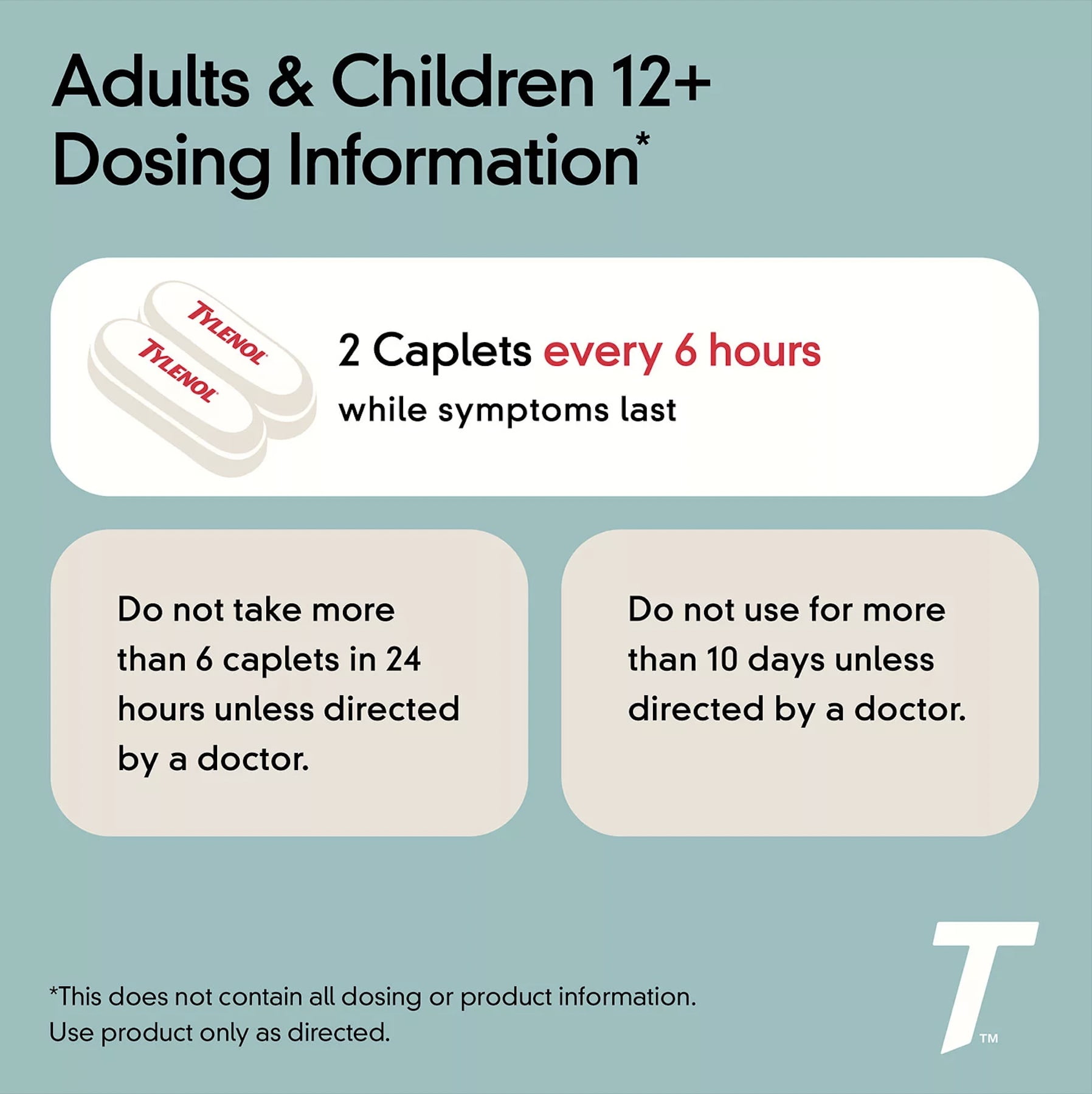- Contains acetaminophen. Contains no aspirin. 50 pouches of 2 caplets each. This package for households without young children