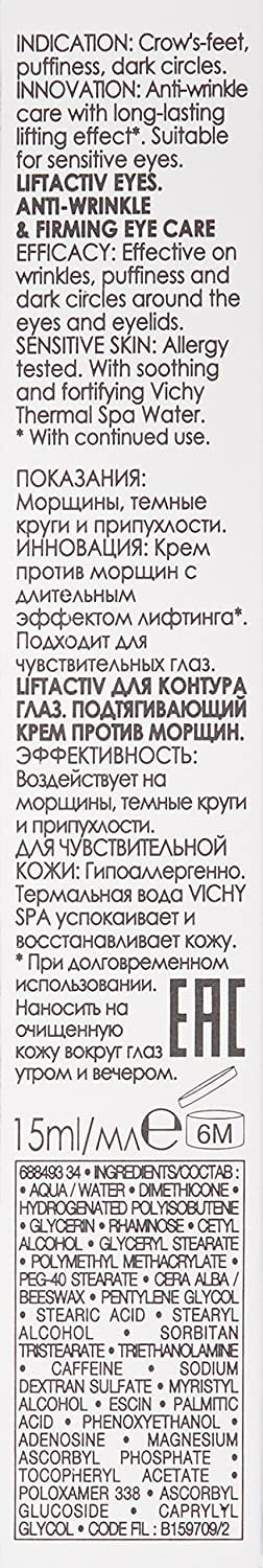 Eye Care, Anti-Wrinkle & Firming 0.51 fl oz (15 ml) Crow’s-feet – puffiness – dark circles. Paraben-free. Suitable for sensitive eyes. Rhamnose 5% – derm source technology. Long-lasting lifting effect (with continued use). Sensitive skin. Allergy tested. Vichy Thermal Spa Water. Innovation: Anti-wrinkle care with long-lasting lifting effect (with continued use). Suitable for sensitive eyes. Efficacy: Effective on wrinkles, puffiness and dark circles around the eyes and eyelids. Sensitive Skin: Allergy tested. With soothing and fortifying Vichy Thermal Spa Water. Distribution reserved to agreed Vichy suppliers. www.vichy.com. Made in France. Crow’s-feet, puffiness, dark circles. 0.51 fl oz (15 ml) New York, NY 10017