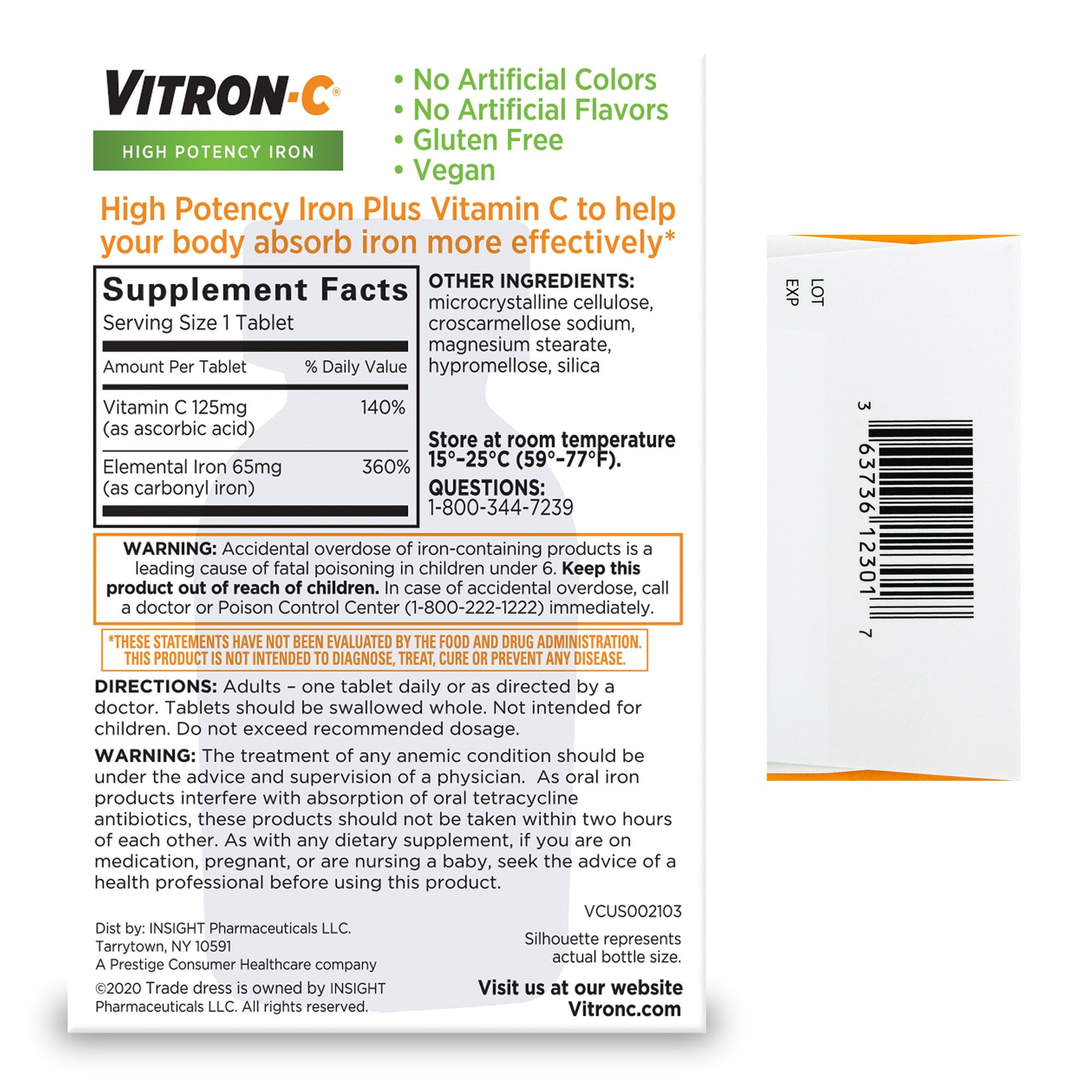 Dietary SupplementInsight PhrmActive Ingredients:Per Tablet: Vitamin C (as Ascorbic Acid and Sodium Ascorbate) 125 mg; Iron (as Ferrous Fumarate) 65 mg; Mono and Di-Glycerides; Microcrystalline Cellulose; Croscarmellose Sodium; Polyvinyl Alcohol; Hydroxypropyl Methyl Cellulose; Polyethylene Glycol; Titanium Dioxide; Talc; Magnesium Stearate; Iron Oxide Red; Iron Oxide YellowAdults: One or two tablets daily or as directed by a physician. Tablets should be swallowed whole. Do not exceed recommended dosage. Store at room temperature, 15 degrees – 25 degrees C (59 degrees – 77 degrees F).Uses:High potency iron dietary supplement, plus Vitamin C to help your body absorb dietary iron more effectively. Easy on the stomach. Less constipation. New easy open bottle.Accidental overdose of iron-containing products is the leading cause of fatal poisoning in children under 6. Keep this product out of reach of children. In case of accidental overdose, call a doctor or poison control center immediately. The treatment of any anemic condition should be under the advice and supervision of a physician. As oral iron products interfere with absorption of oral tetracycline antibiotics, these products should not be taken within two hours of each other. As with any dietary supplement, if you are pregnant or nursing a baby, seek the advice of a health professional before using this product. Dietary SupplementInsight PhrmActive Ingredients:Per Tablet: Vitamin C (as Ascorbic Acid and Sodium Ascorbate) 125 mg; Iron (as Ferrous Fumarate) 65 mg; Mono and Di-Glycerides; Microcrystalline Cellulose; Croscarmellose Sodium; Polyvinyl Alcohol; Hydroxypropyl Methyl Cellulose; Polyethylene Glycol; Titanium Dioxide; Talc; Magnesium Stearate; Iron Oxide Red; Iron Oxide YellowAdults: One or two tablets daily or as directed by a physician. Tablets should be swallowed whole. Do not exceed recommended dosage. Store at room temperature, 15 degrees – 25 degrees C (59 degrees – 77 degrees F). Uses:High potency iron dietary supplement, plus Vitamin C to help your body absorb dietary iron more effectively. Easy on the stomach. Less constipation. New easy open bottle.Accidental overdose of iron-containing products is the leading cause of fatal poisoning in children under 6. Keep this product out of reach of children. In case of accidental overdose, call a doctor or poison control center immediately. The treatment of any anemic condition should be under the advice and supervision of a physician. As oral iron products interfere with absorption of oral tetracycline antibiotics, these products should not be taken within two hours of each other. As with any dietary supplement, if you are pregnant or nursing a baby, seek the advice of a health professional before using this product.