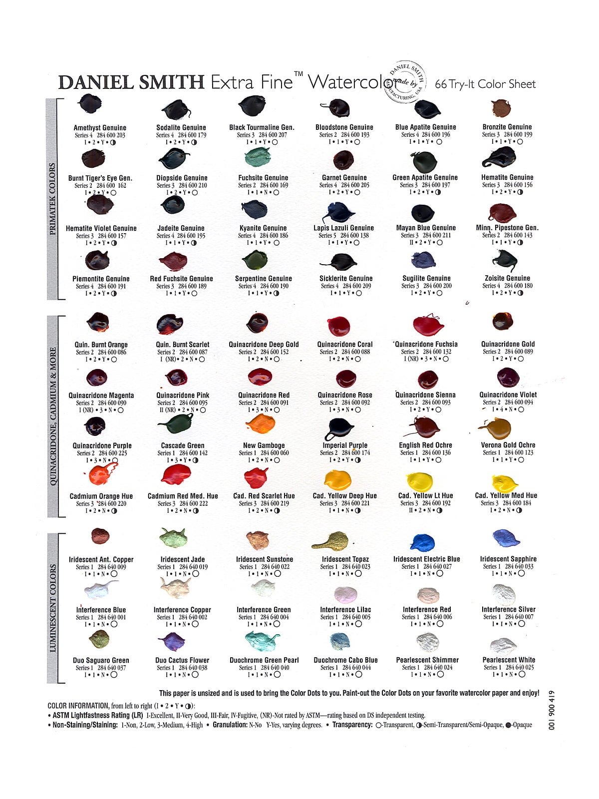 Daniel Smith Dot Cards are an excellent way to try out colors before purchasing a full tube of paint. The Dot Cards feature usable swatches of Daniel Smith Extra Fine Watercolors. Apply a wet brush to the swatch, and paint the color to a surface. Use Dot Cards to test colors, test papers and surfaces, or experiment with color blending.Watercolor Dot Cards 66 Dot Card (pack of 3)